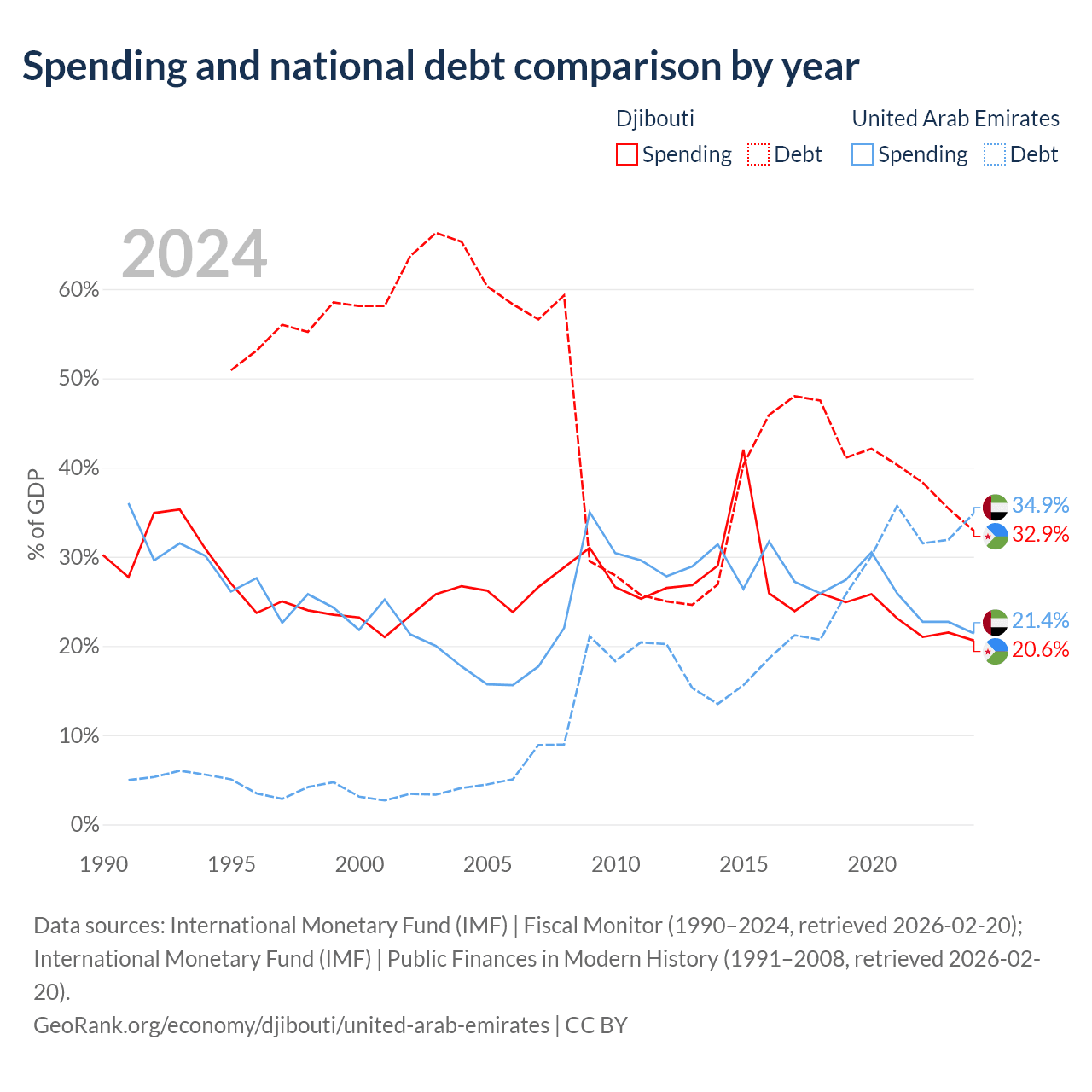 Djibouti has $1.36B in government debt (32.9% of GDP), compared to $193B (34.9% of GDP) in the United Arab Emirates.
