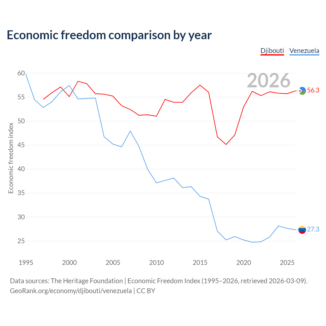 The Economic Freedom Index for Djibouti is 56.3, ranking 122/197, compared to 27.3 for Venezuela, ranking 194/197. The chart above displays a comparison of annual changes in economic freedom indexes.