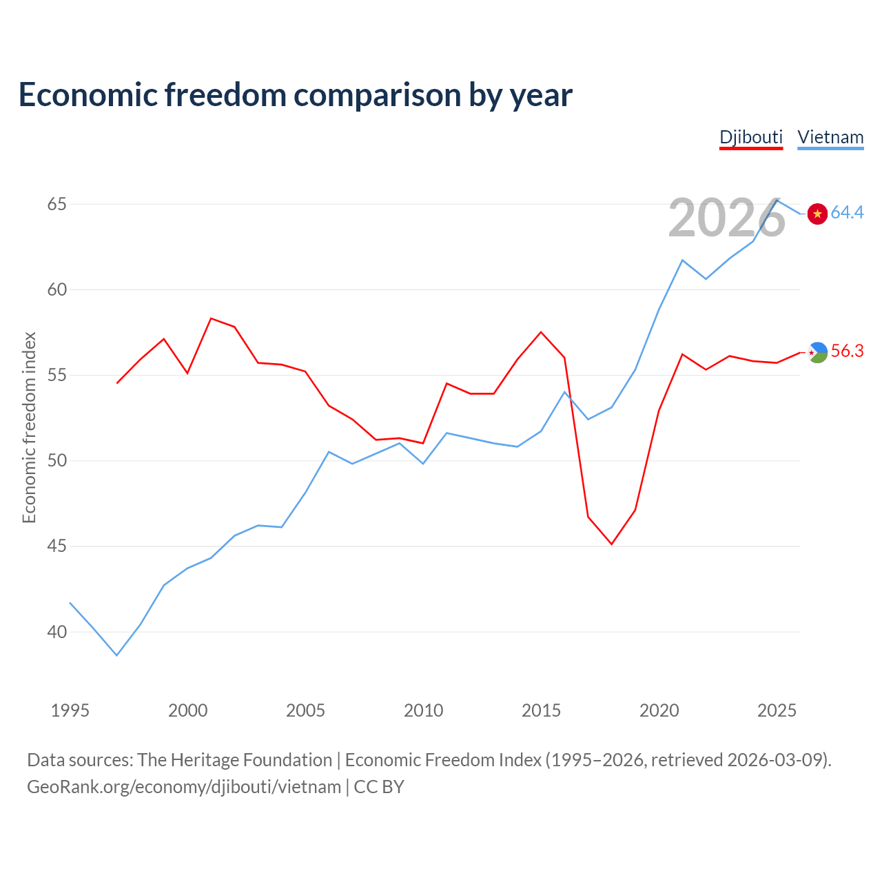 The Economic Freedom Index for Djibouti is 56.3, ranking 122/197, compared to 64.4 for Vietnam, ranking 73/197. The chart above displays a comparison of annual changes in economic freedom indexes.
