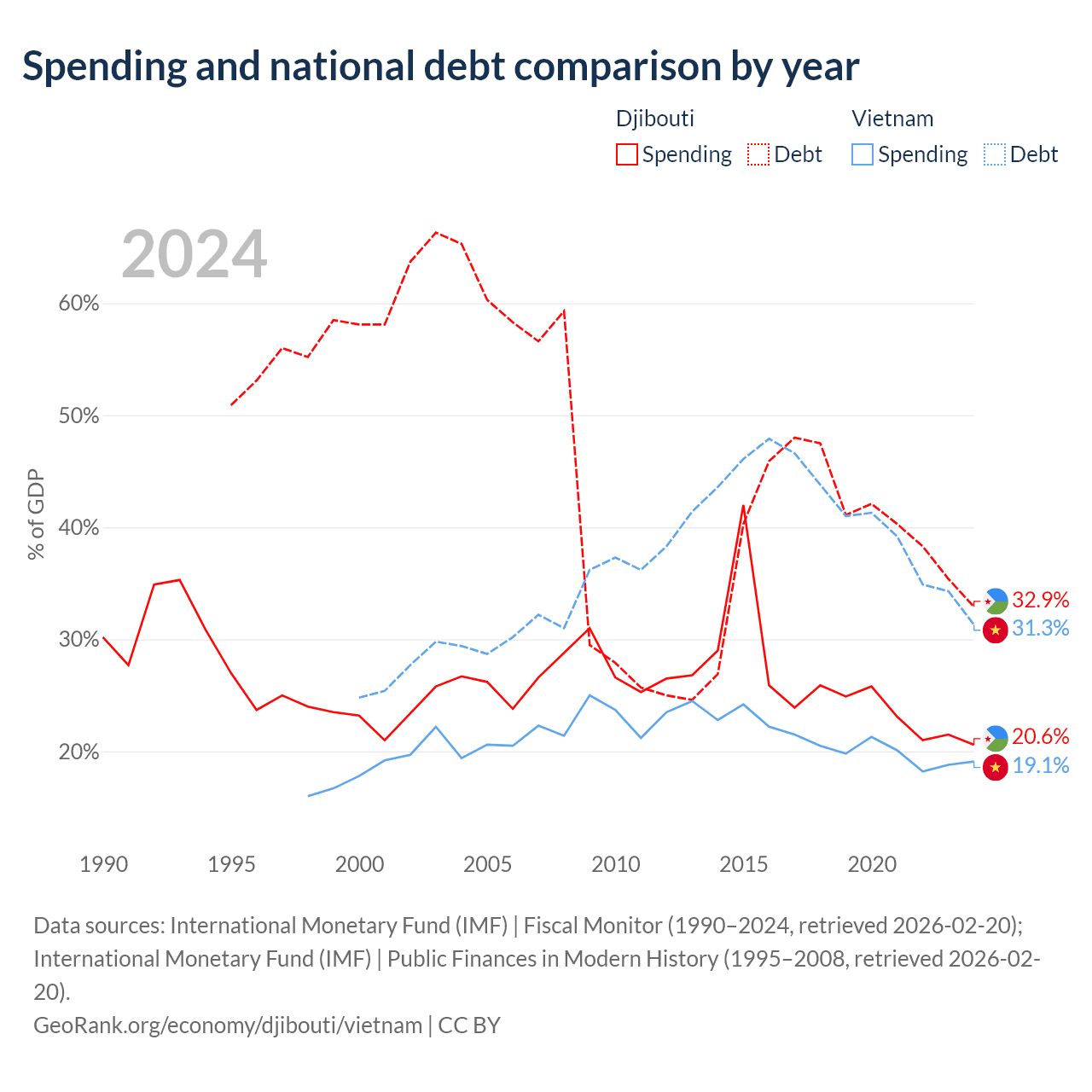 Djibouti has $1.36B in government debt (32.9% of GDP), compared to $149B (31.3% of GDP) in Vietnam.