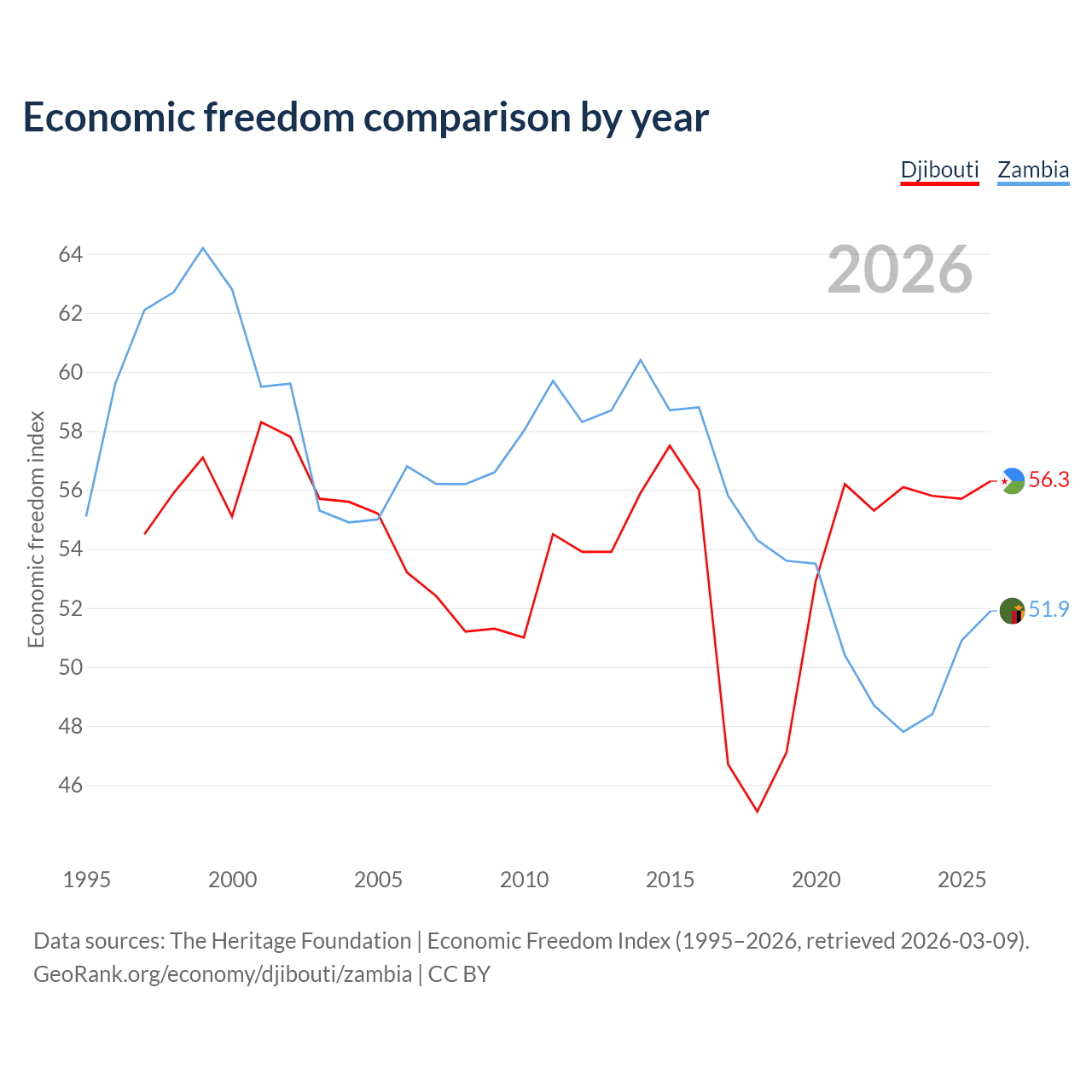 The Economic Freedom Index for Djibouti is 56.3, ranking 122/197, compared to 51.9 for Zambia, ranking 152/197. The chart above displays a comparison of annual changes in economic freedom indexes.
