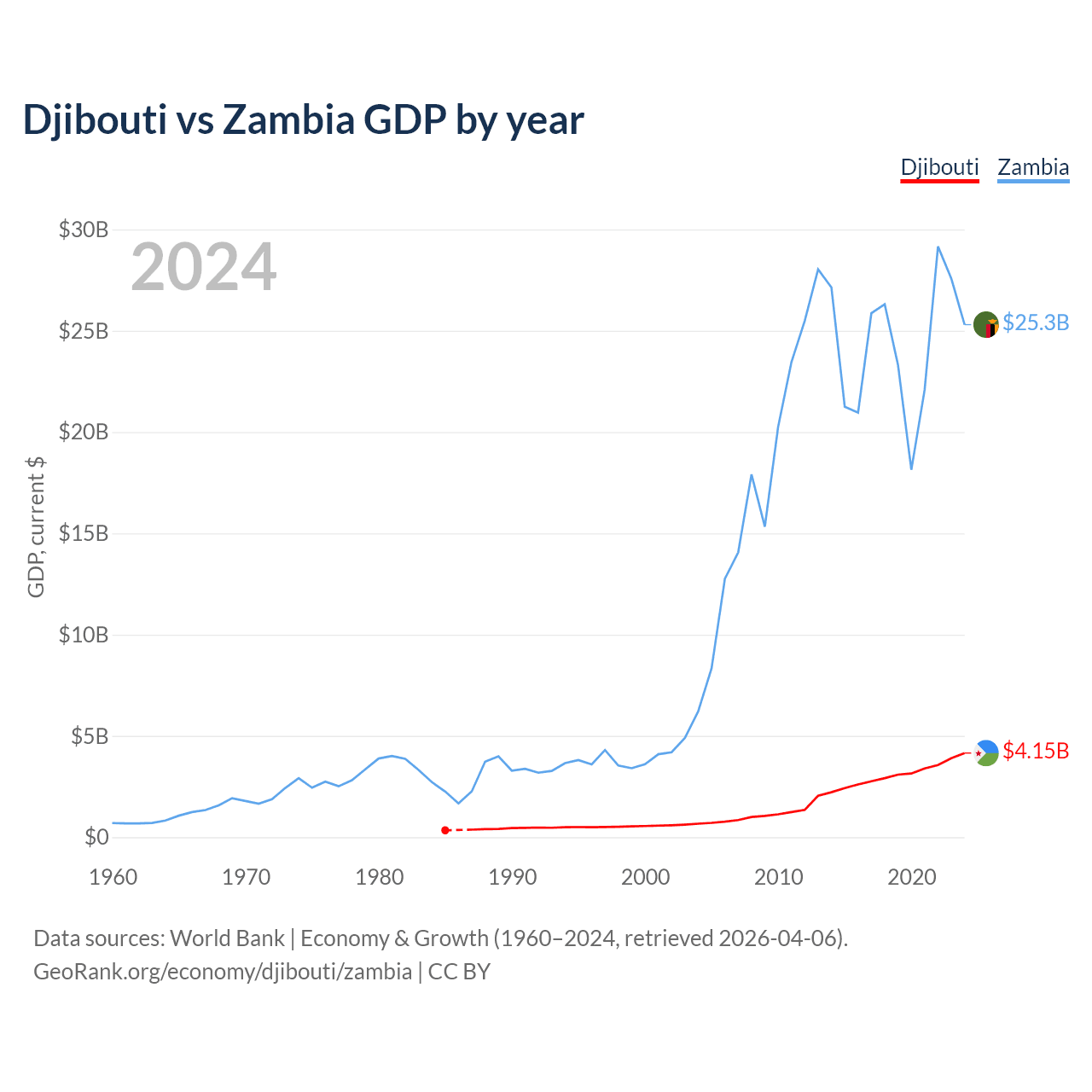 Djibouti has a GDP of $4.15B compared to $25.3B for Zambia, ranking 165/197 and 116/197 by economy size, respectively.