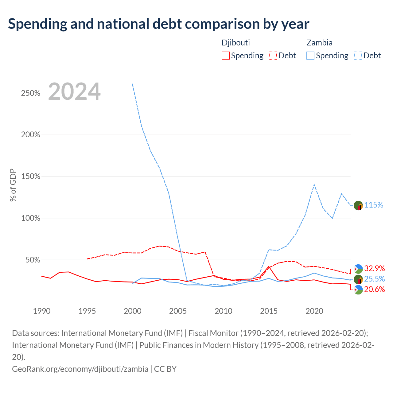 Djibouti has $1.36B in government debt (32.9% of GDP), compared to $29.1B (114.9% of GDP) in Zambia.