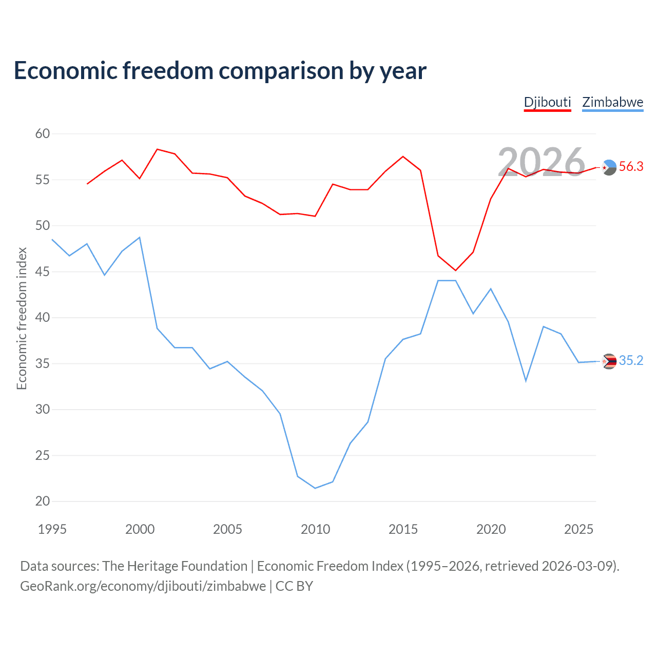 The Economic Freedom Index for Djibouti is 56.3, ranking 122/197, compared to 35.2 for Zimbabwe, ranking 190/197. The chart above displays a comparison of annual changes in economic freedom indexes.