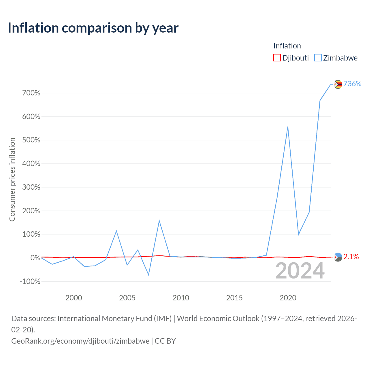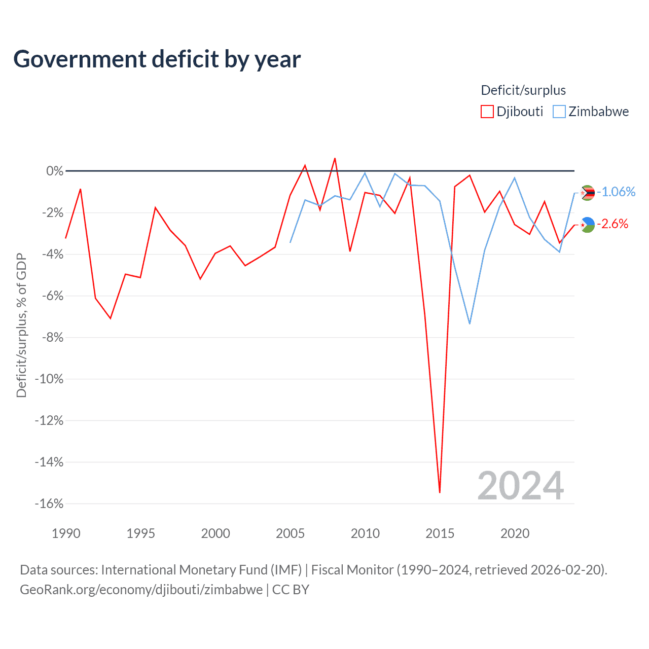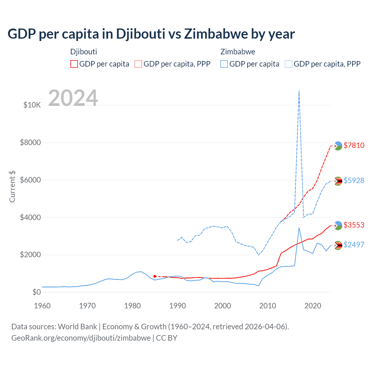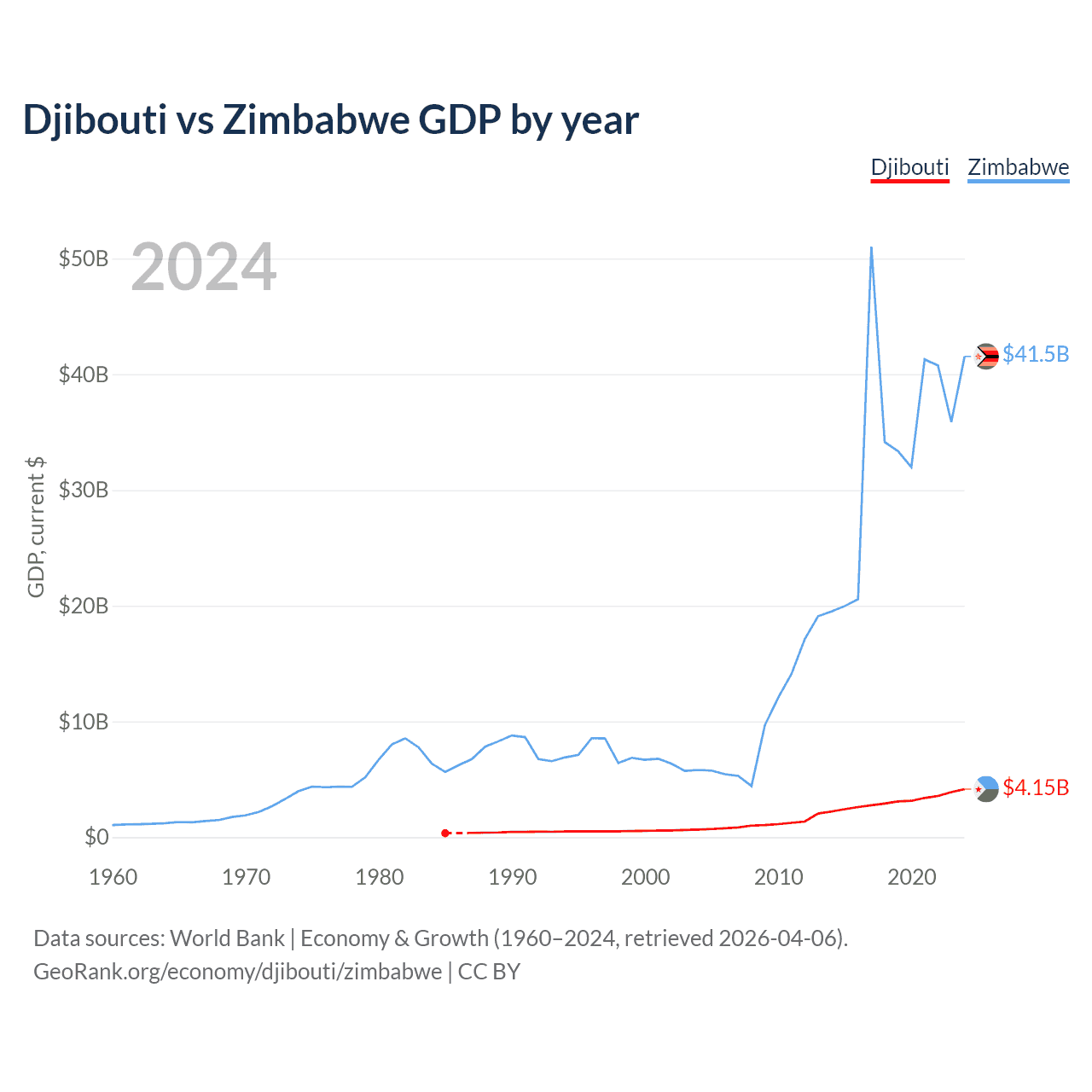 Djibouti has a GDP of $4.15B compared to $41.5B for Zimbabwe, ranking 165/197 and 102/197 by economy size, respectively.