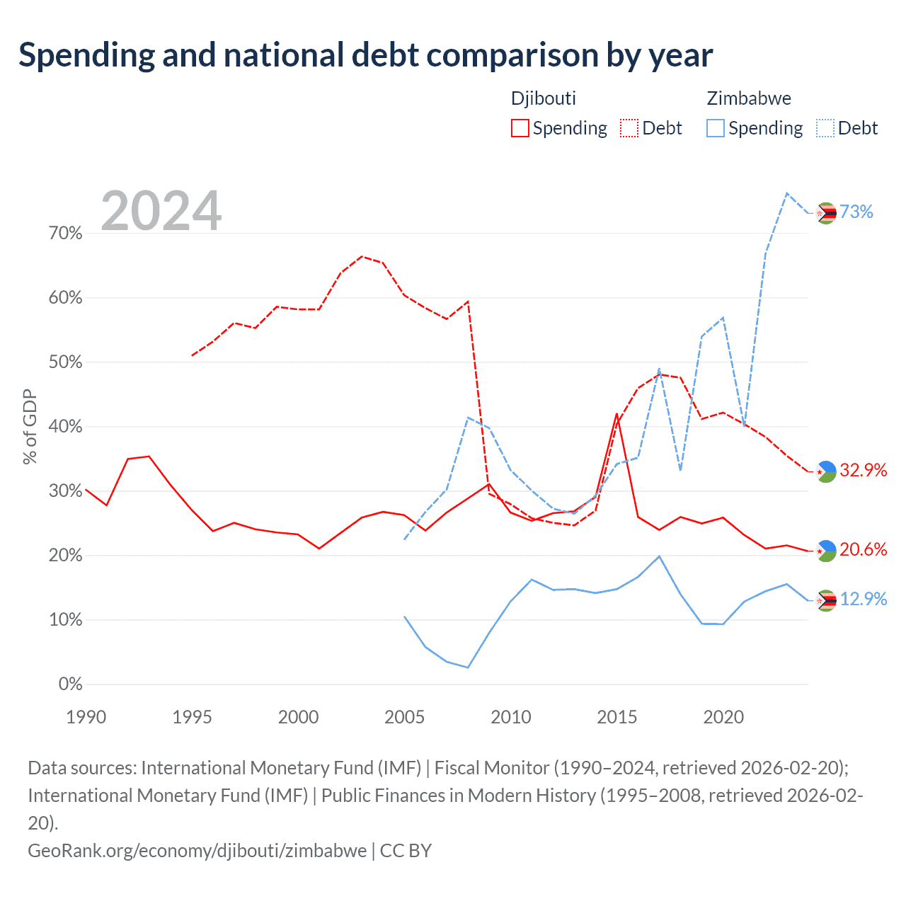 Djibouti has $1.36B in government debt (32.9% of GDP), compared to $30.3B (73% of GDP) in Zimbabwe.