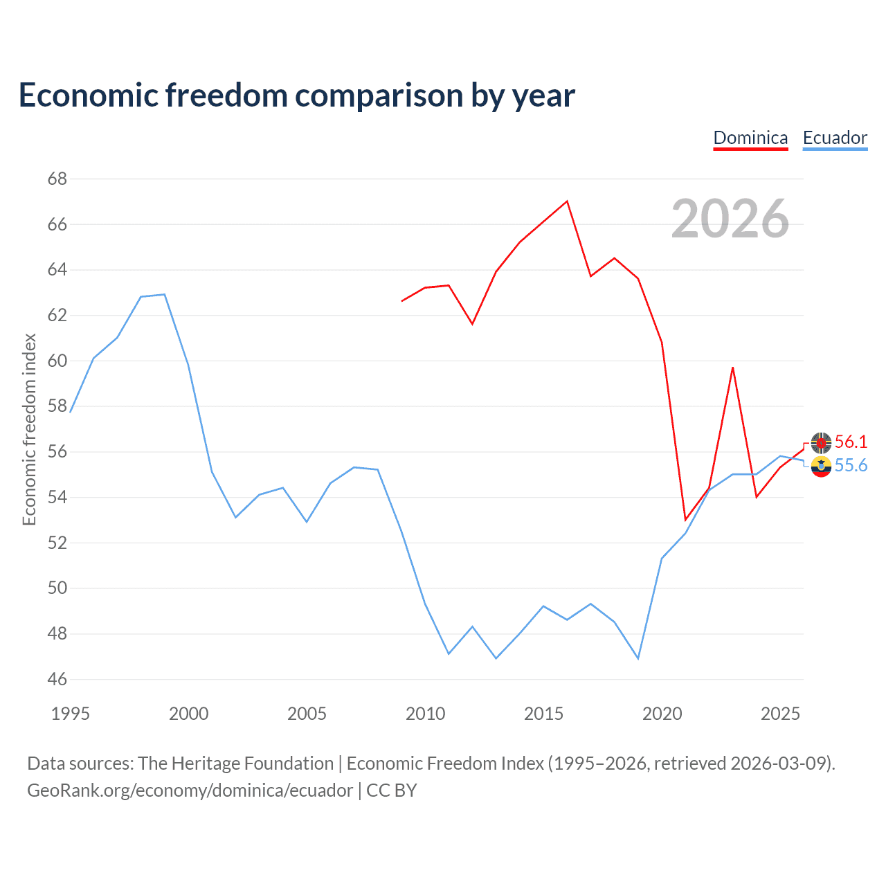 The Economic Freedom Index for Dominica is 56.1, ranking 124/197, compared to 55.6 for Ecuador, ranking 127/197. The chart above displays a comparison of annual changes in economic freedom indexes.
