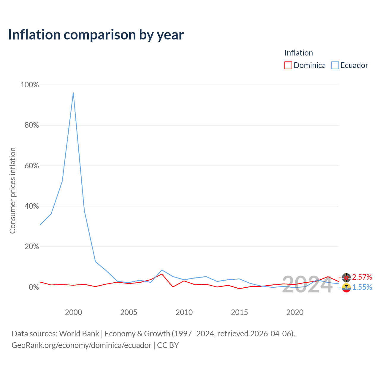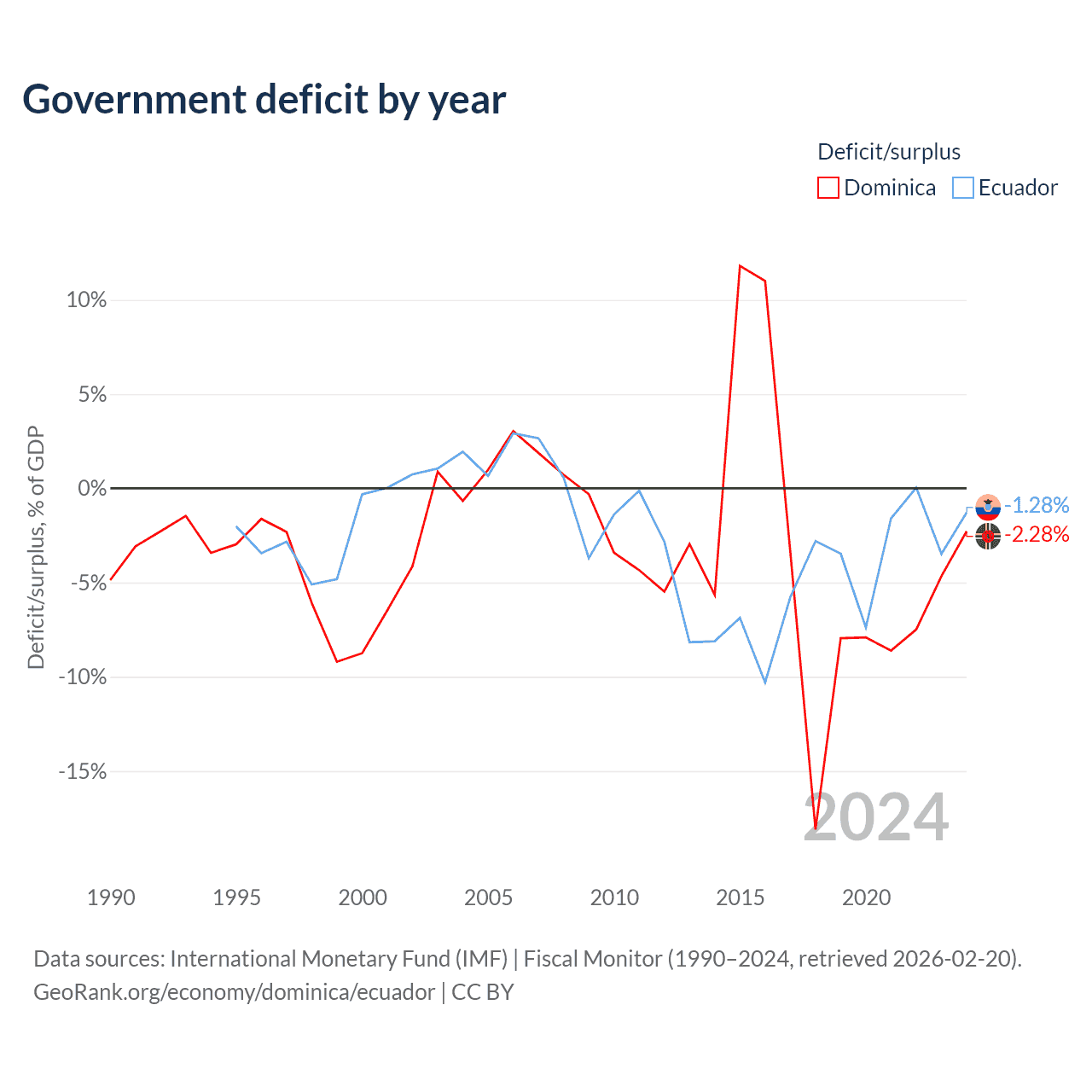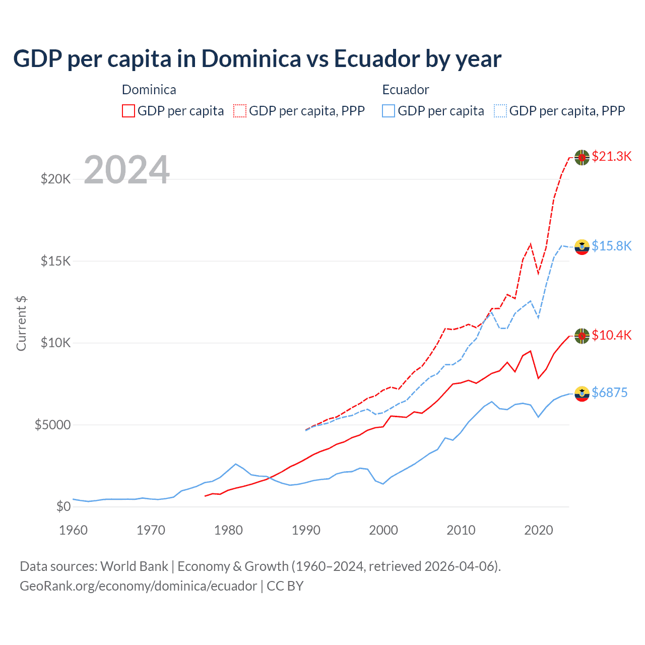 Dominica has a GDP of $689M compared to $125B for Ecuador, ranking 190/197 and 62/197 by economy size, respectively.