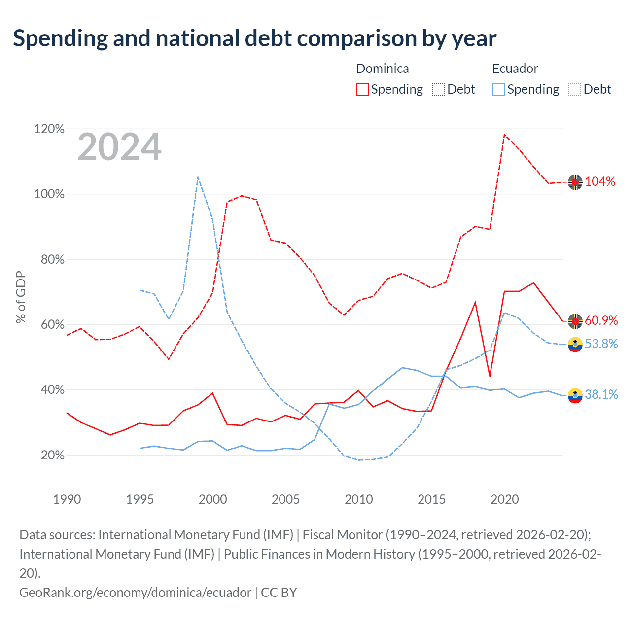 Dominica has $713M in government debt (103.5% of GDP), compared to $67B (53.8% of GDP) in Ecuador.