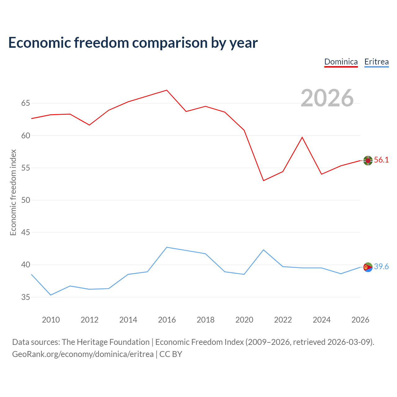 The Economic Freedom Index for Dominica is 56.1, ranking 124/197, compared to 39.6 for Eritrea, ranking 188/197. The chart above displays a comparison of annual changes in economic freedom indexes.