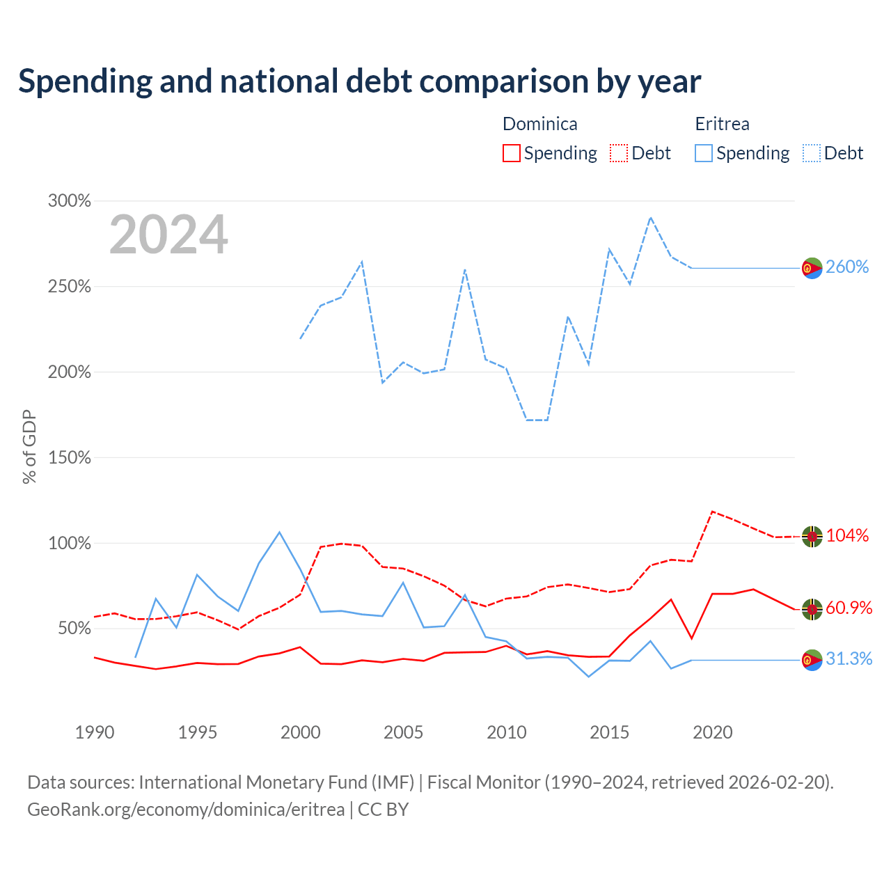 Dominica has $713M in government debt (103.5% of GDP), compared to $3.54B (260.4% of GDP) in Eritrea.