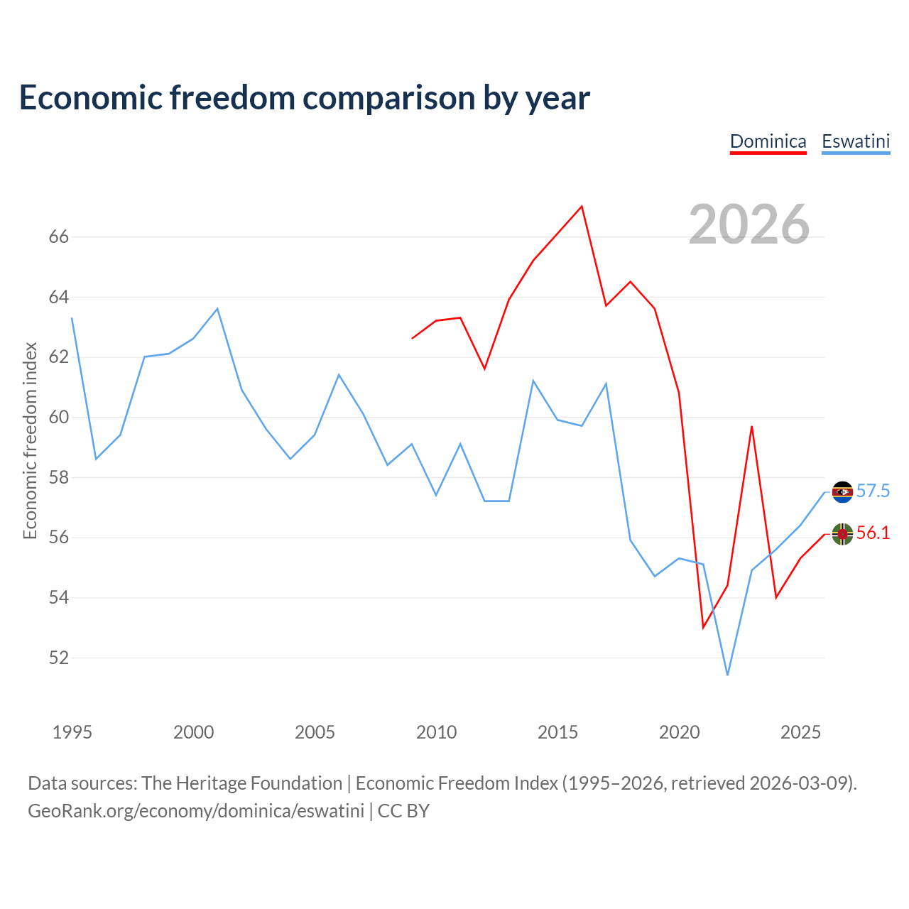 The Economic Freedom Index for Dominica is 56.1, ranking 124/197, compared to 57.5 for Eswatini, ranking 116/197. The chart above displays a comparison of annual changes in economic freedom indexes.