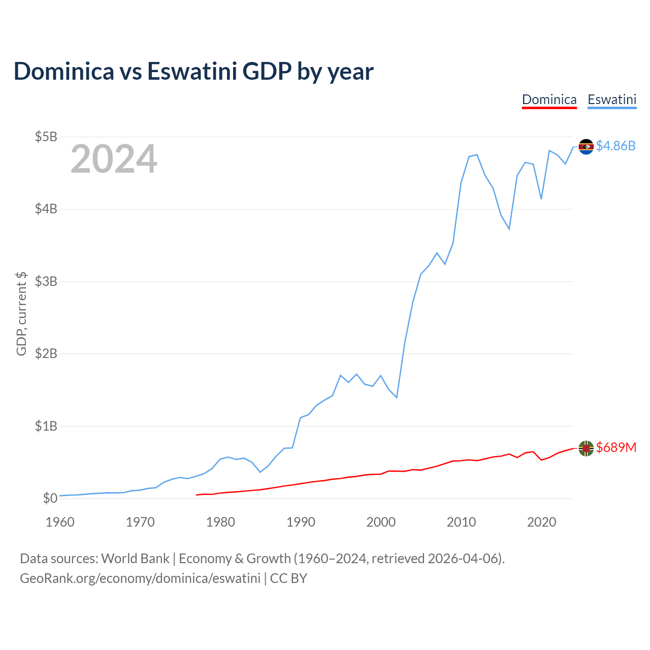 Dominica has a GDP of $689M compared to $4.86B for Eswatini, ranking 190/197 and 162/197 by economy size, respectively.