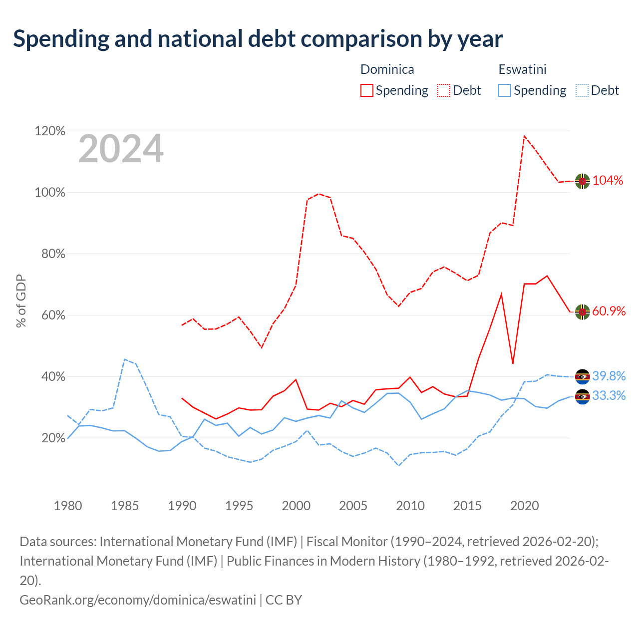 Dominica has $713M in government debt (103.5% of GDP), compared to $1.93B (39.8% of GDP) in Eswatini.