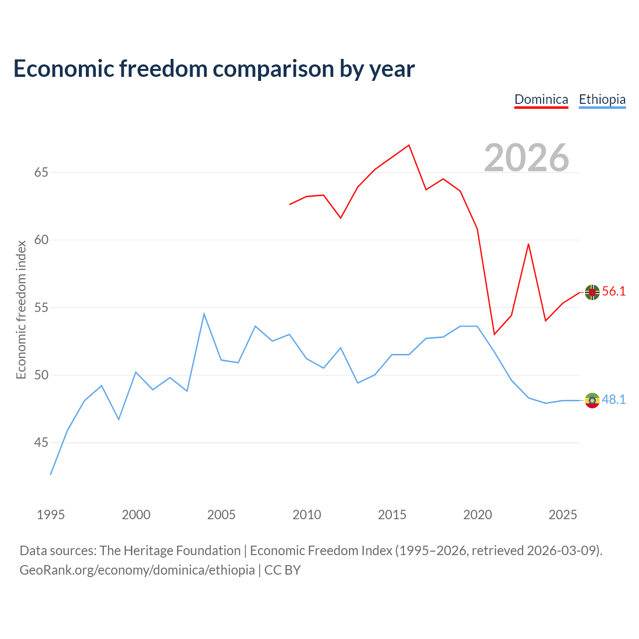 The Economic Freedom Index for Dominica is 56.1, ranking 124/197, compared to 48.1 for Ethiopia, ranking 171/197. The chart above displays a comparison of annual changes in economic freedom indexes.