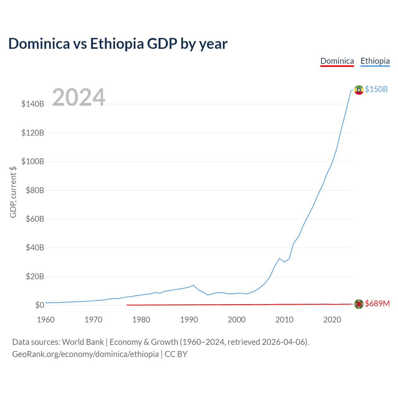 Dominica has a GDP of $689M compared to $150B for Ethiopia, ranking 190/197 and 60/197 by economy size, respectively.