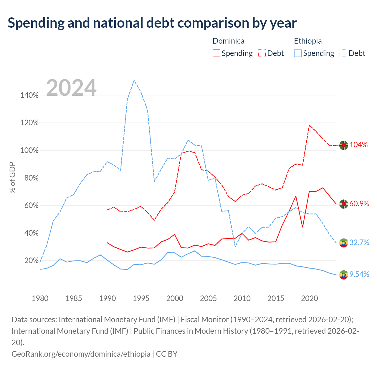 Dominica has $713M in government debt (103.5% of GDP), compared to $48.9B (32.7% of GDP) in Ethiopia.