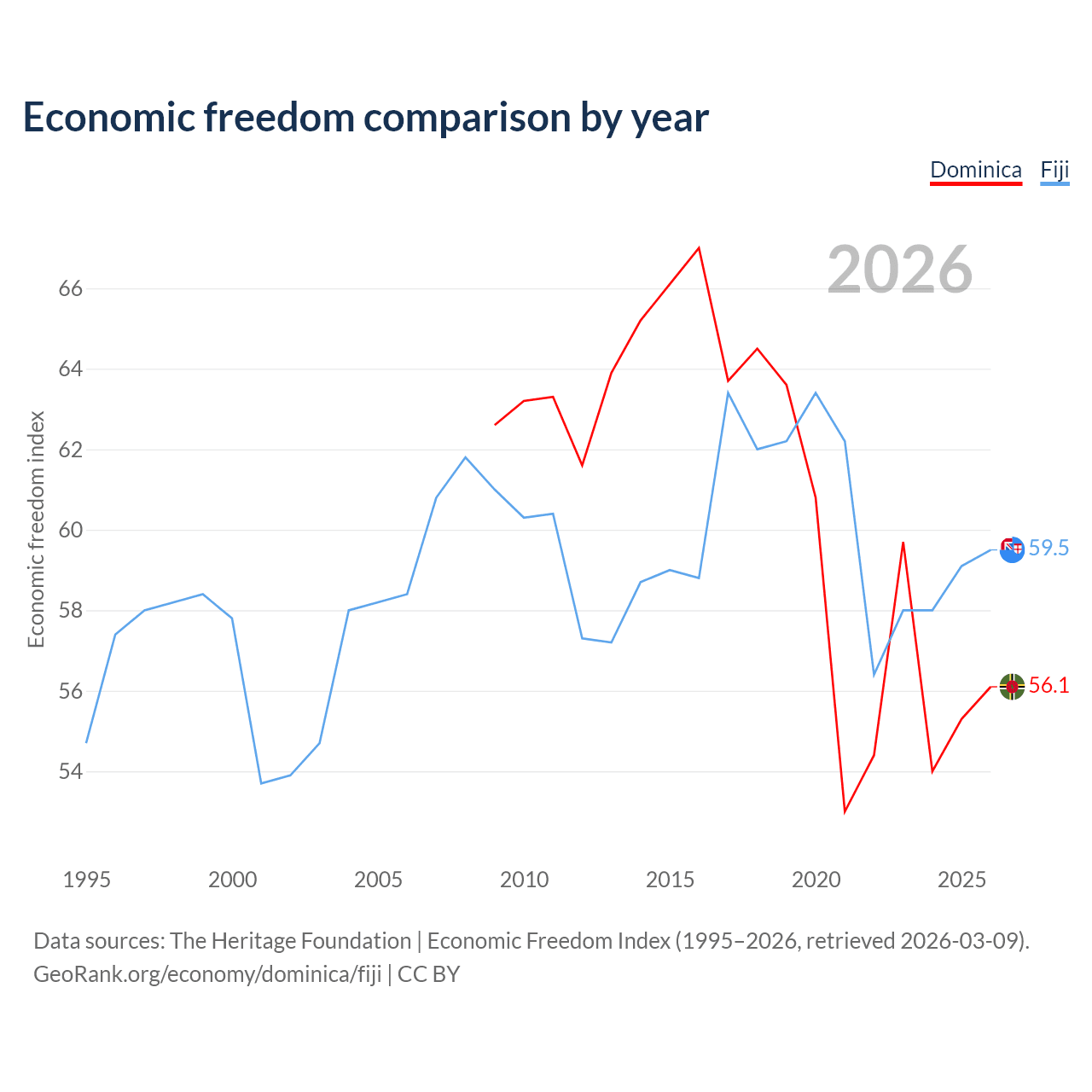 The Economic Freedom Index for Dominica is 56.1, ranking 124/197, compared to 59.5 for Fiji, ranking 103/197. The chart above displays a comparison of annual changes in economic freedom indexes.