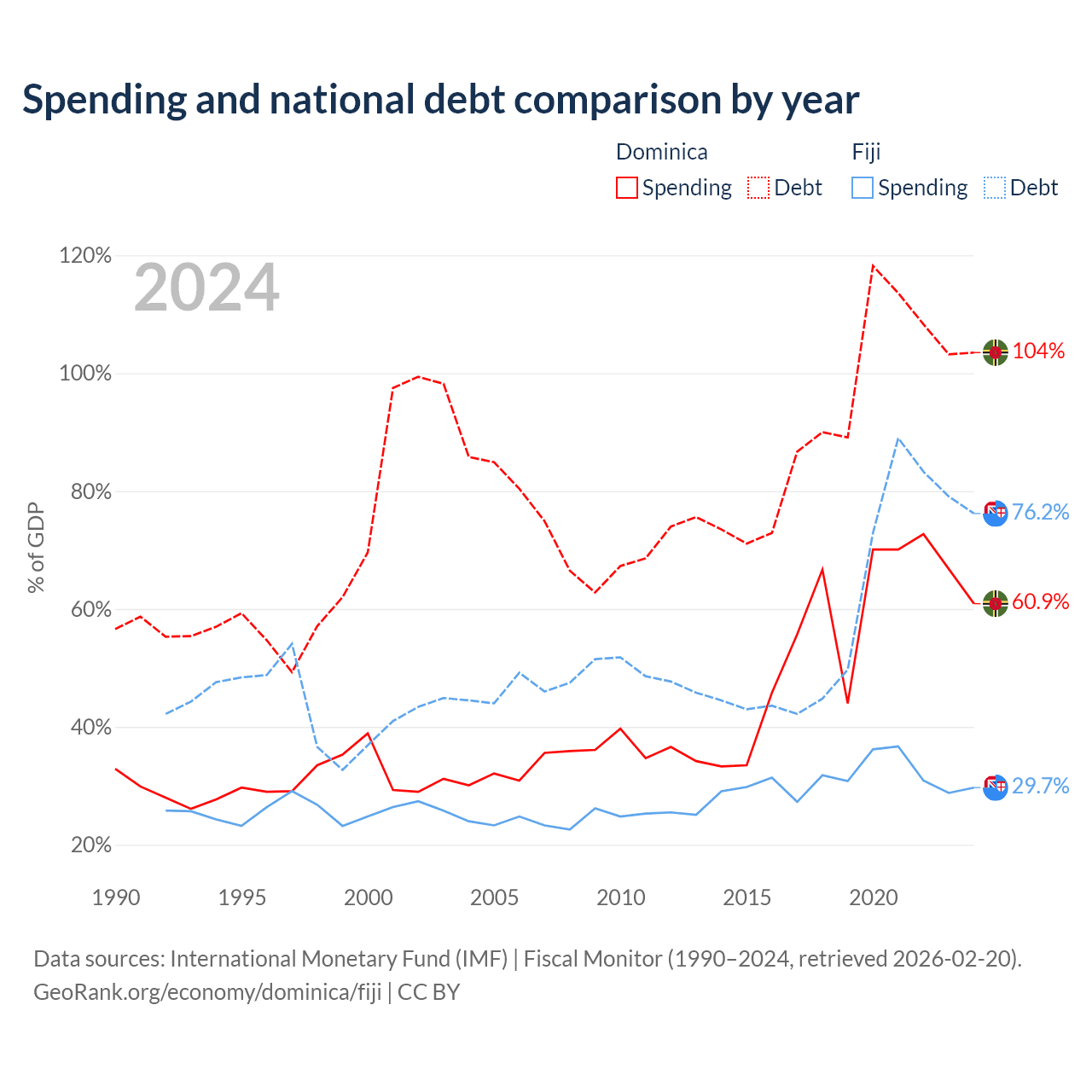 Dominica has $713M in government debt (103.5% of GDP), compared to $4.54B (76.2% of GDP) in Fiji.