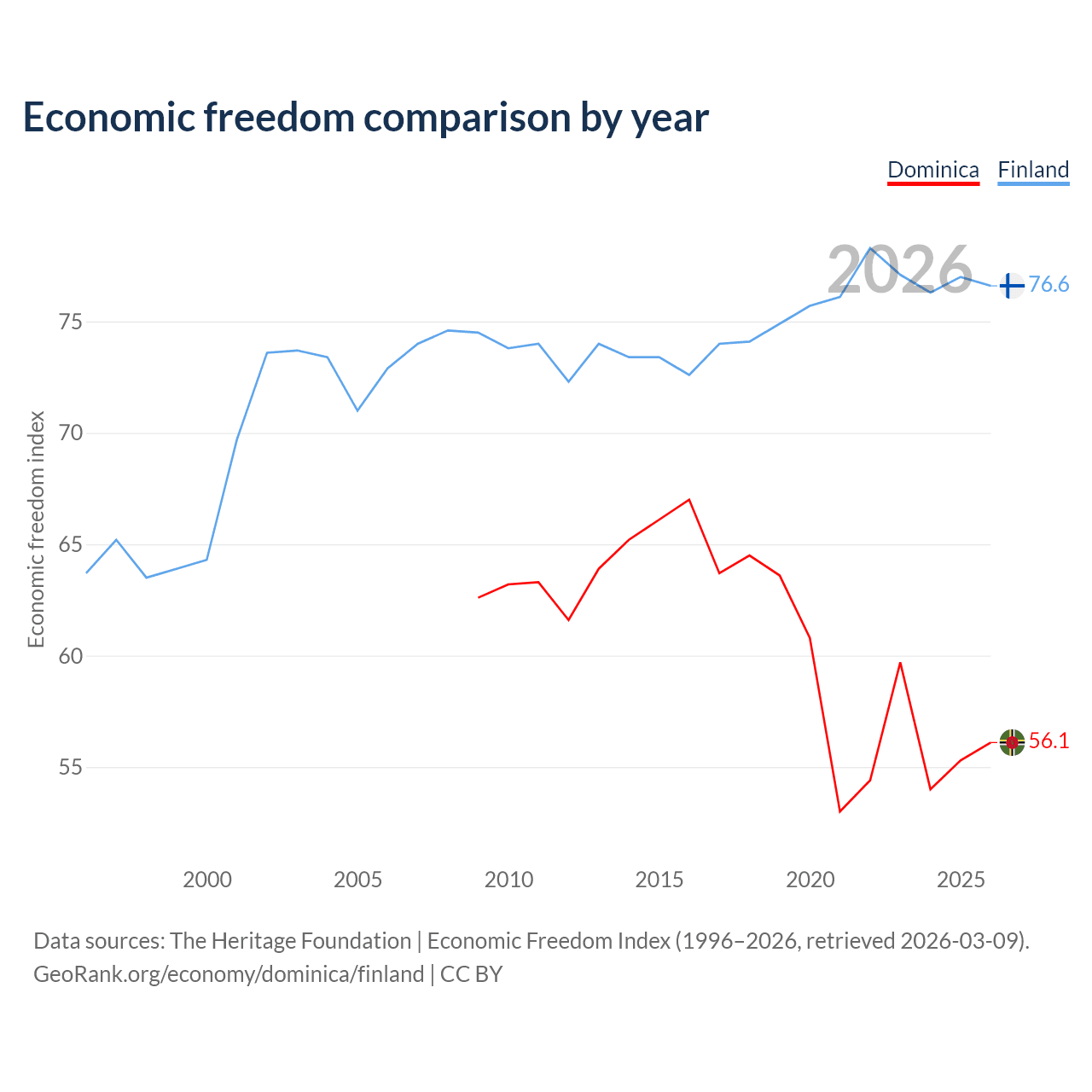 The Economic Freedom Index for Dominica is 56.1, ranking 124/197, compared to 76.6 for Finland, ranking 15/197. The chart above displays a comparison of annual changes in economic freedom indexes.