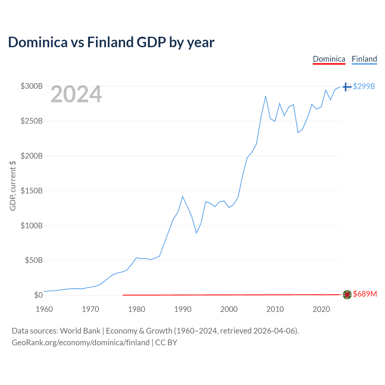 Dominica has a GDP of $689M compared to $299B for Finland, ranking 190/197 and 47/197 by economy size, respectively.