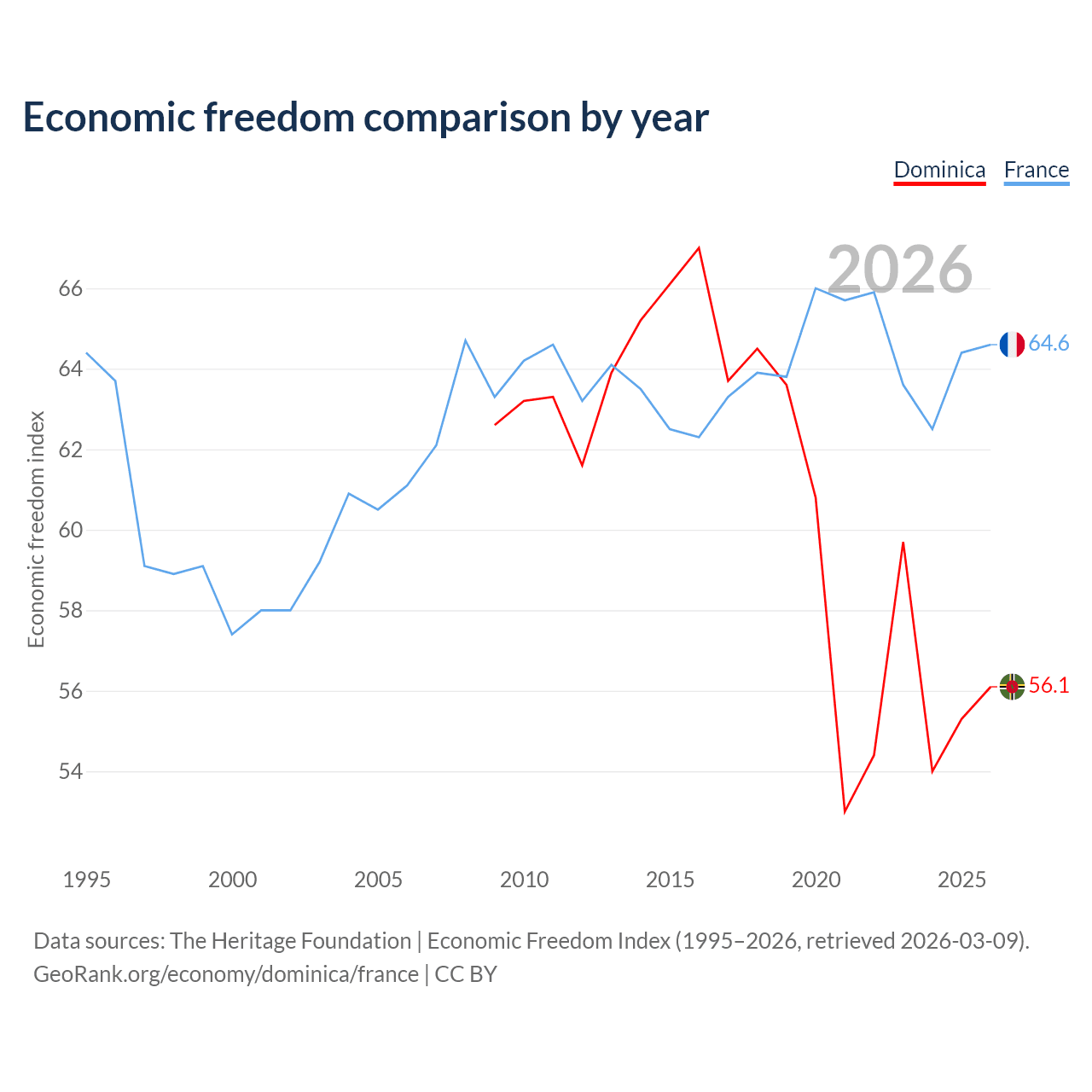 The Economic Freedom Index for Dominica is 56.1, ranking 124/197, compared to 64.6 for France, ranking 72/197. The chart above displays a comparison of annual changes in economic freedom indexes.