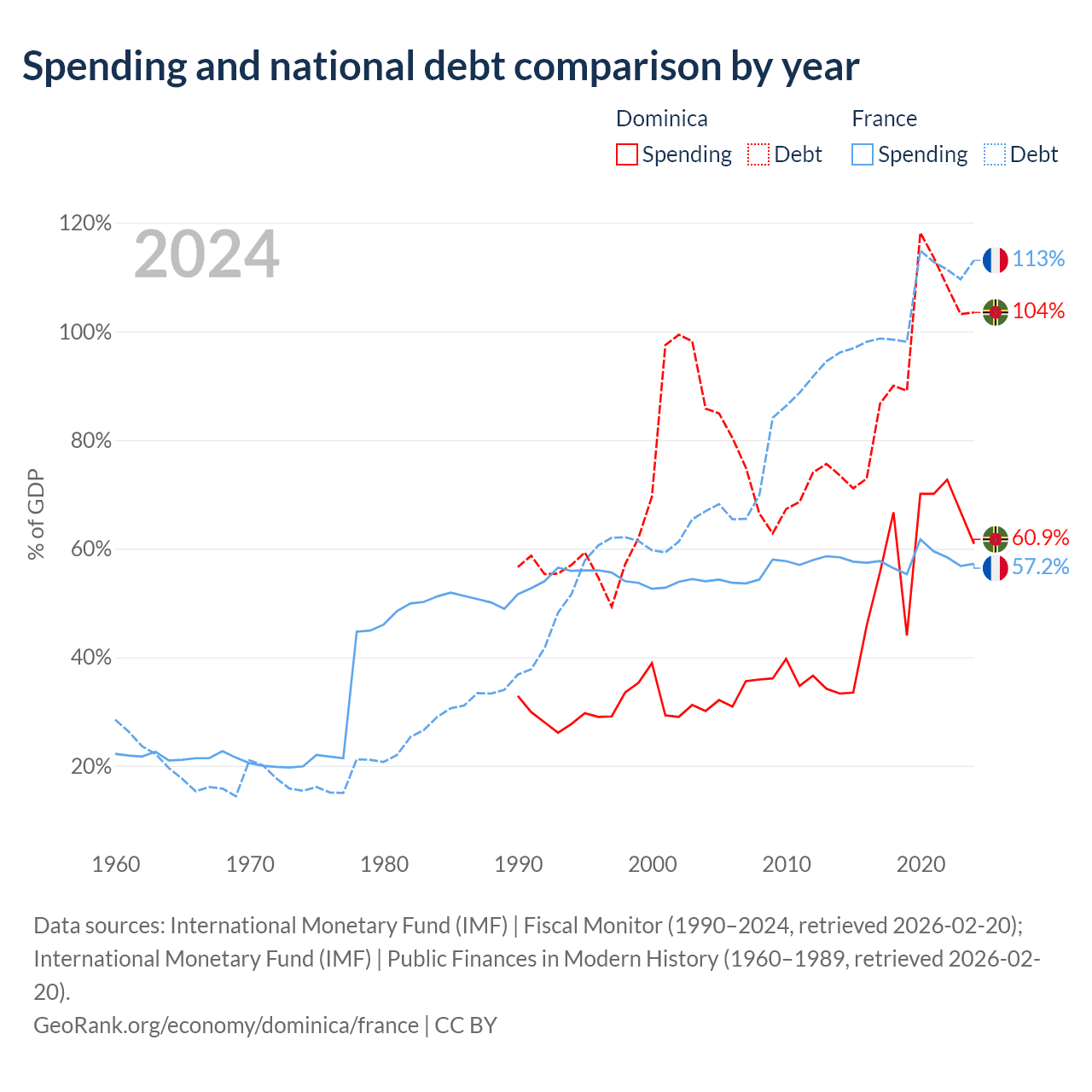 Dominica has $713M in government debt (103.5% of GDP), compared to $3.58T (113.1% of GDP) in France.