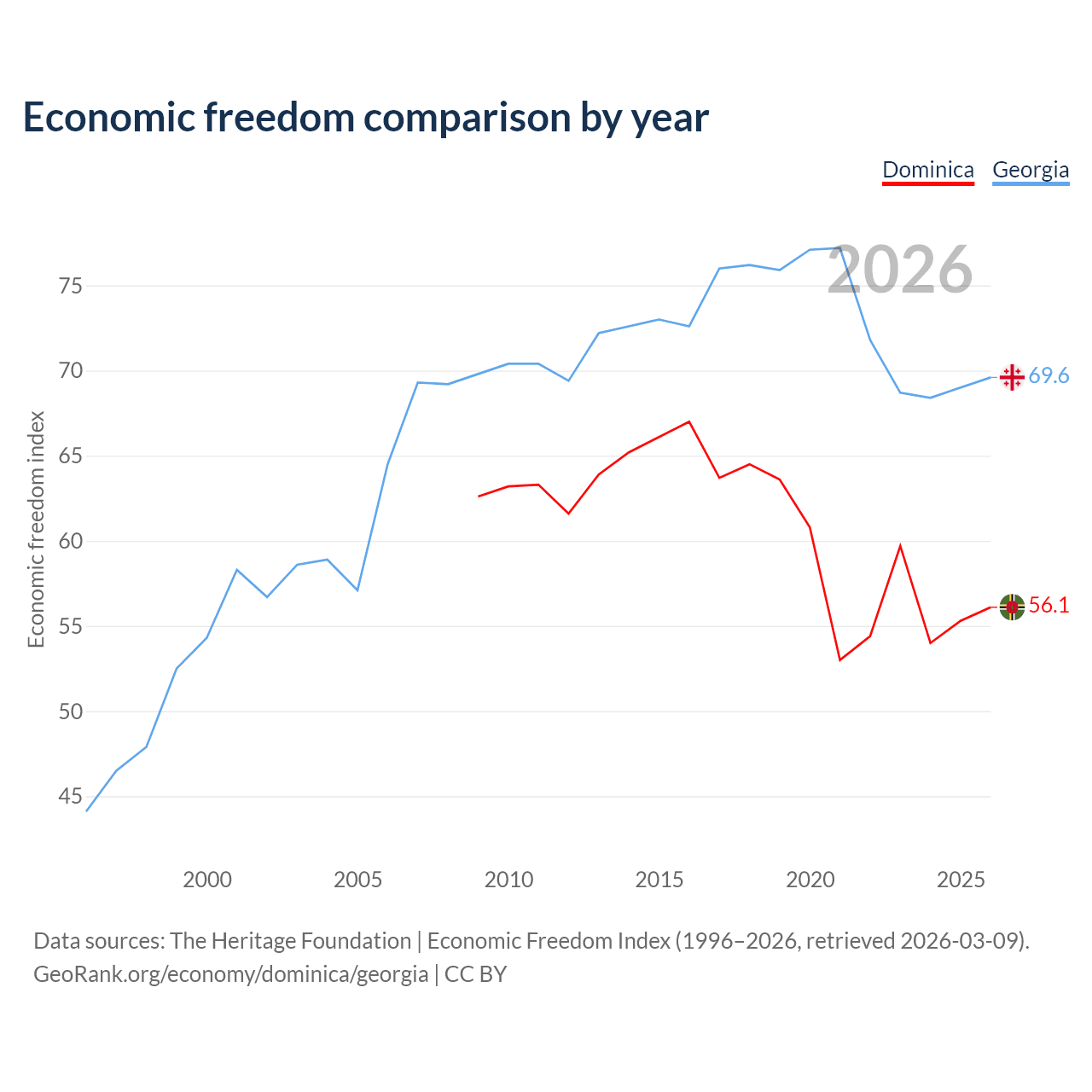 The Economic Freedom Index for Dominica is 56.1, ranking 124/197, compared to 69.6 for Georgia, ranking 41/197. The chart above displays a comparison of annual changes in economic freedom indexes.