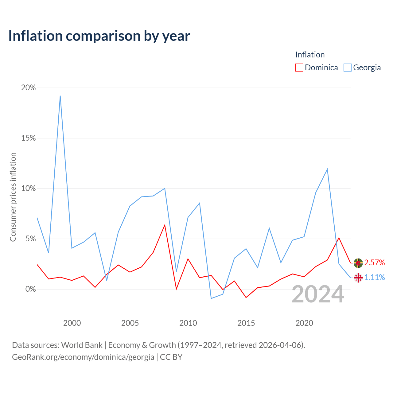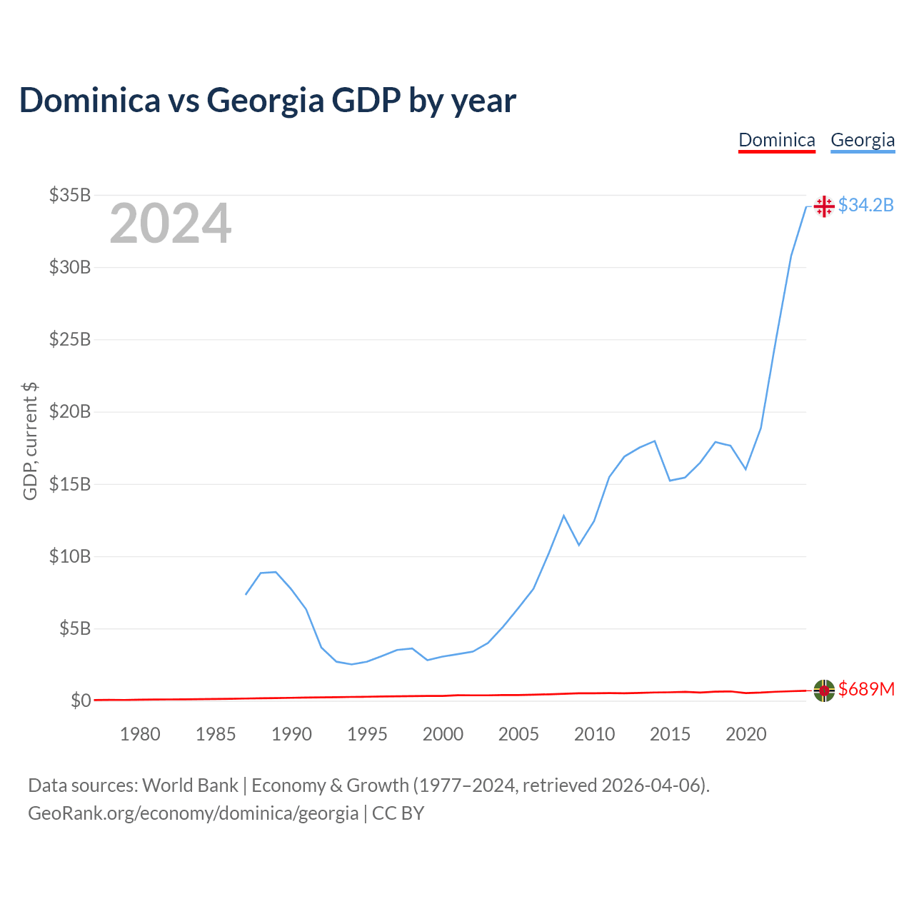 Dominica has a GDP of $689M compared to $34.2B for Georgia, ranking 190/197 and 107/197 by economy size, respectively.