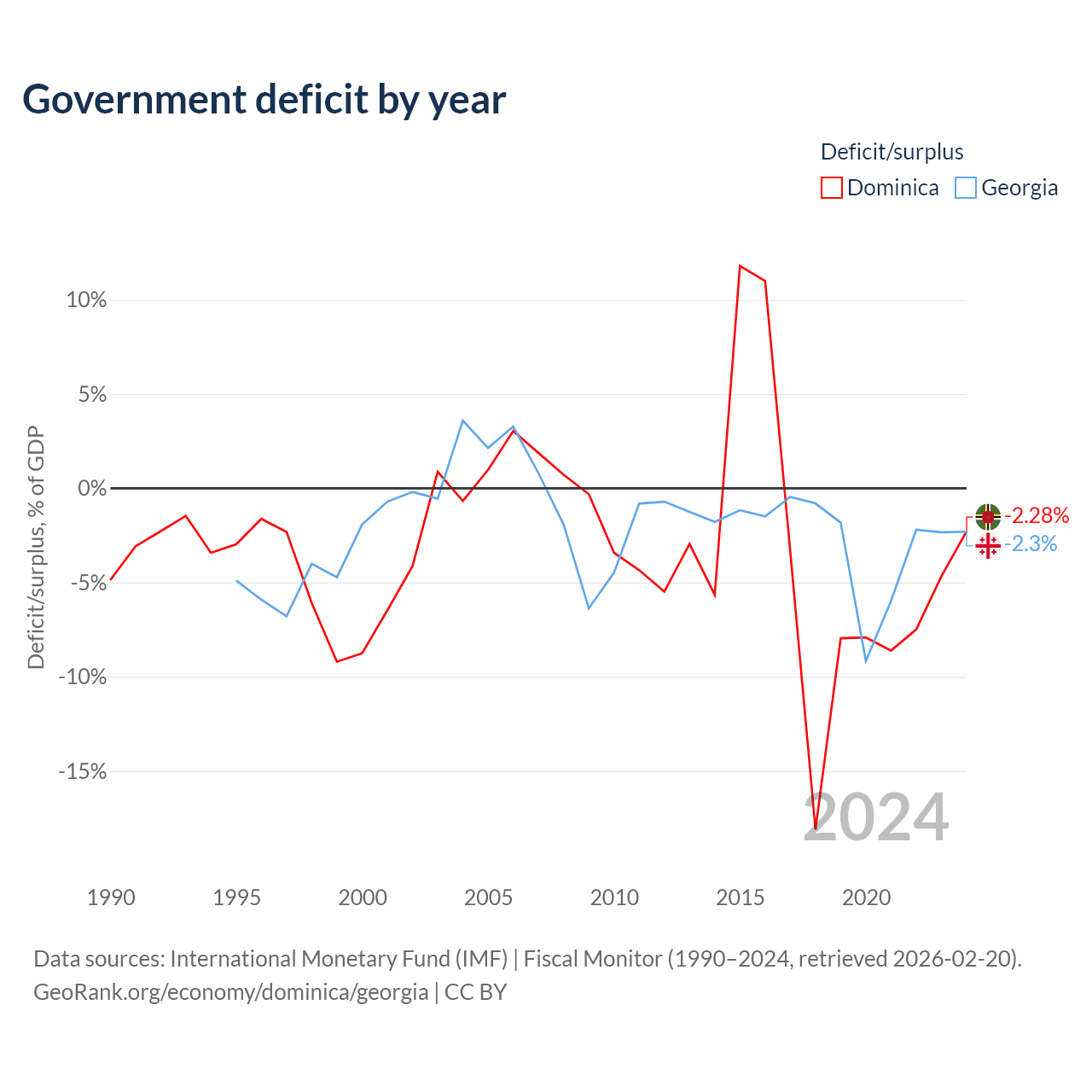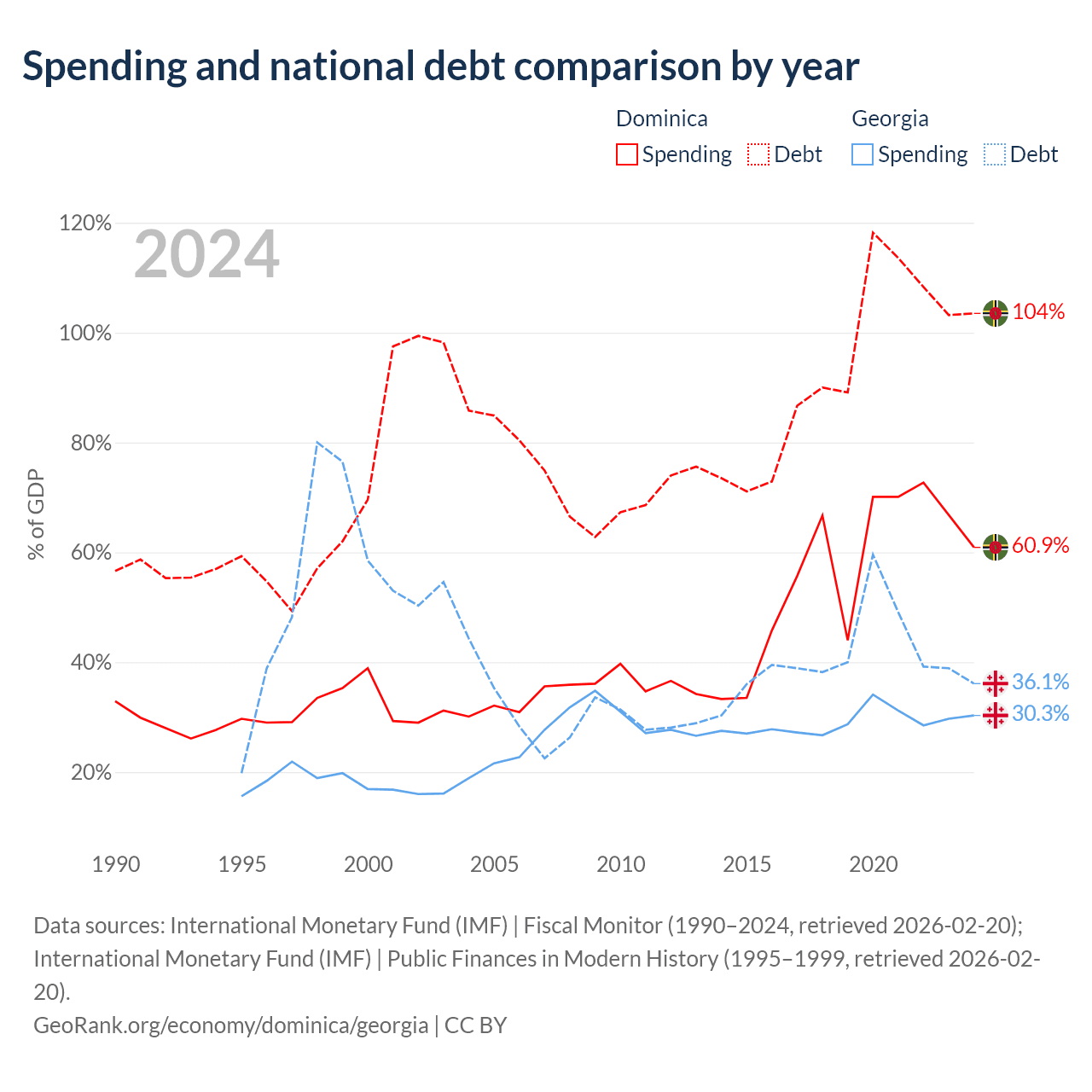 Dominica has $713M in government debt (103.5% of GDP), compared to $12.3B (36.1% of GDP) in Georgia.