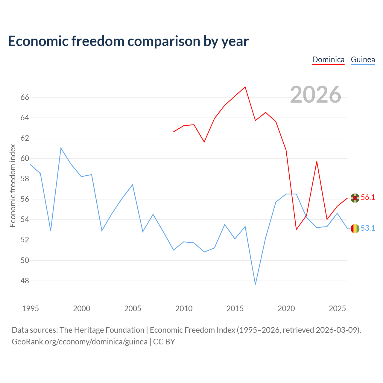 The Economic Freedom Index for Dominica is 56.1, ranking 124/197, compared to 53.1 for Guinea, ranking 141/197. The chart above displays a comparison of annual changes in economic freedom indexes.