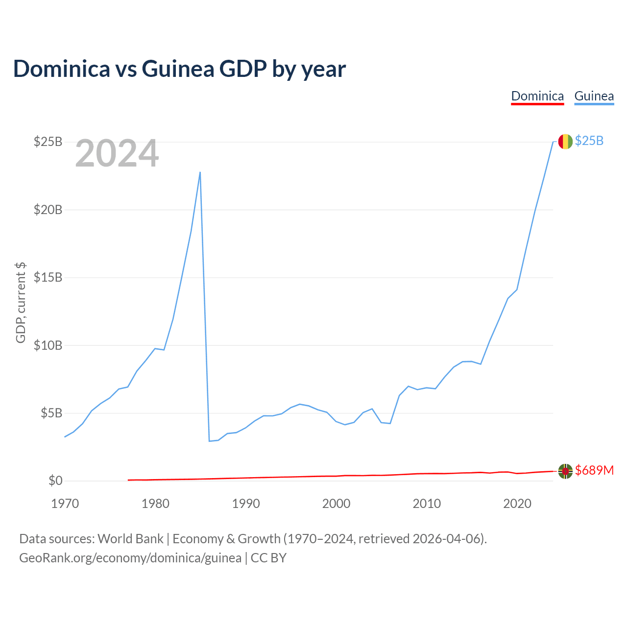 Dominica has a GDP of $689M compared to $25B for Guinea, ranking 190/197 and 118/197 by economy size, respectively.