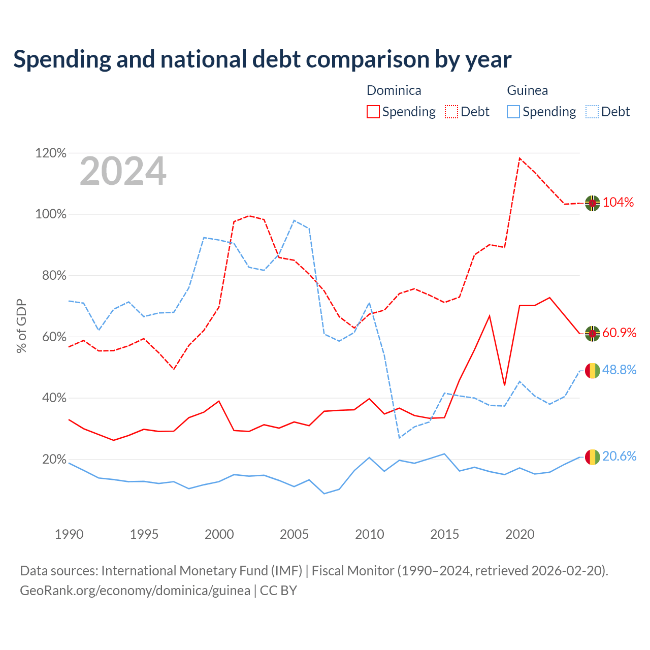 Dominica has $713M in government debt (103.5% of GDP), compared to $12.2B (48.8% of GDP) in Guinea.