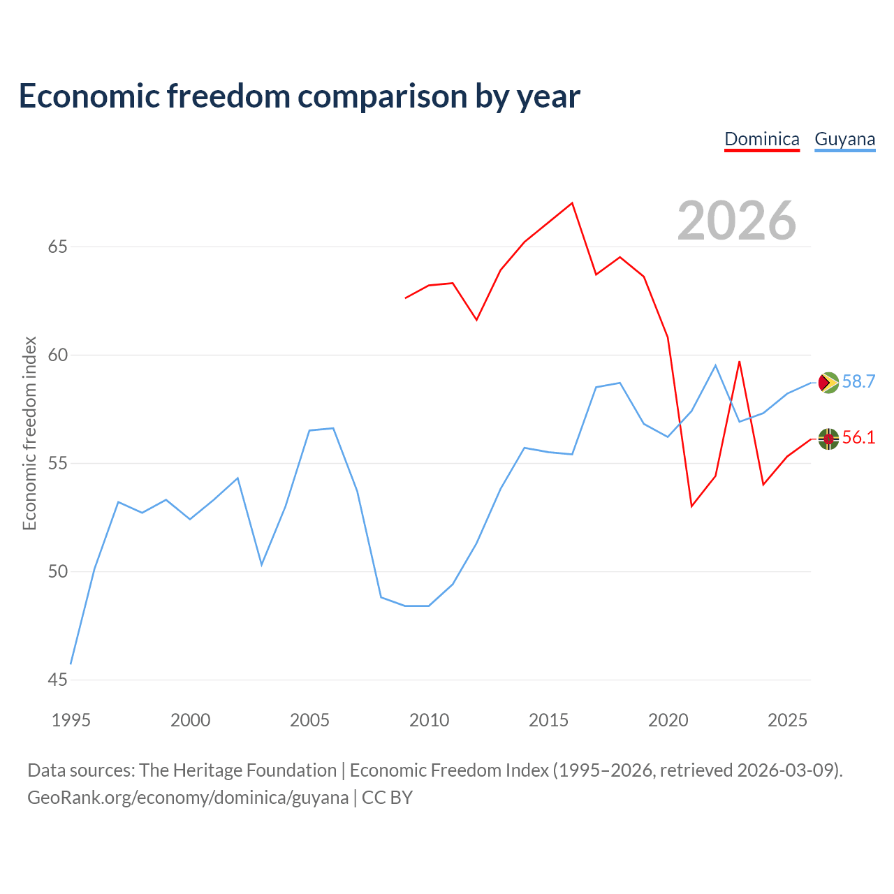 The Economic Freedom Index for Dominica is 56.1, ranking 124/197, compared to 58.7 for Guyana, ranking 109/197. The chart above displays a comparison of annual changes in economic freedom indexes.