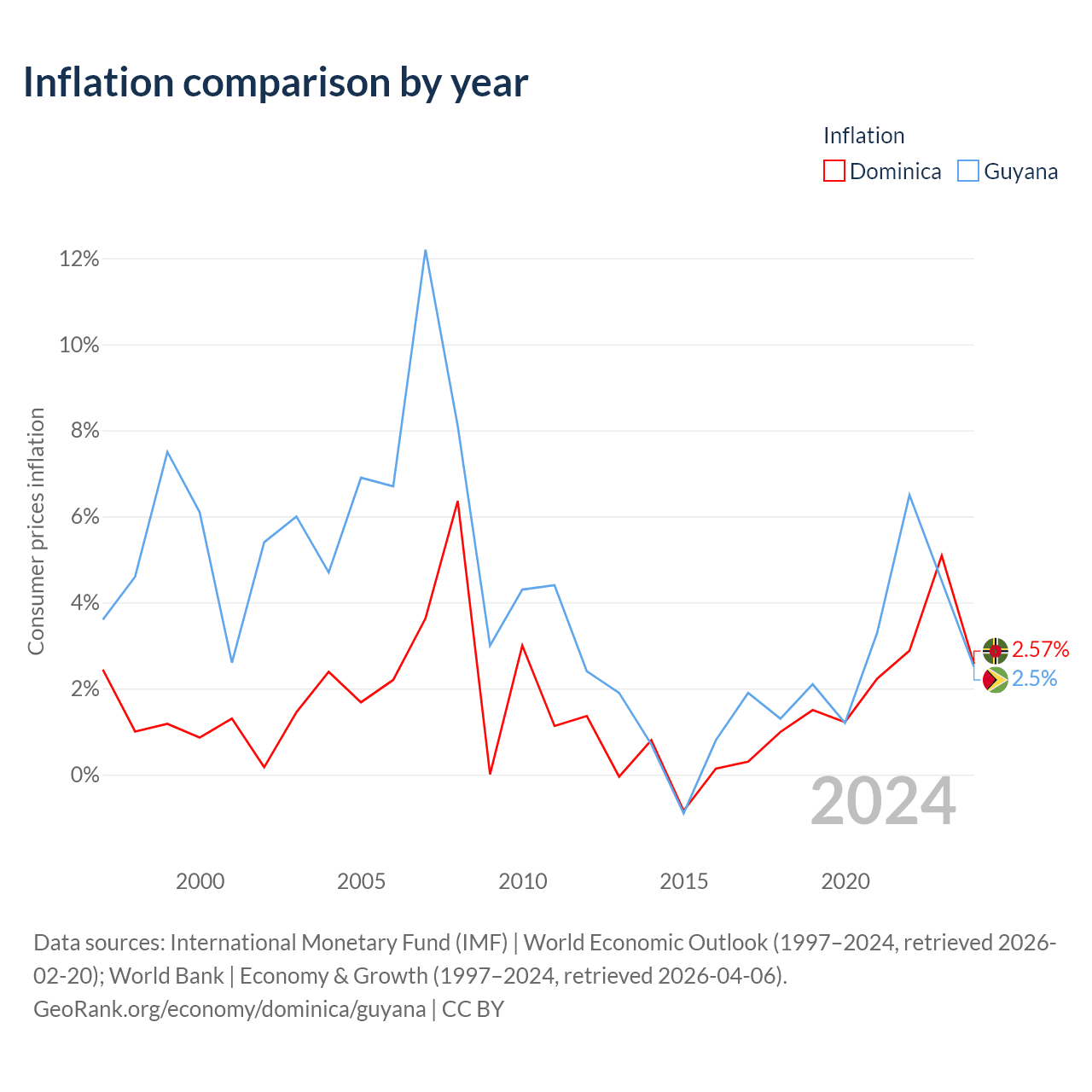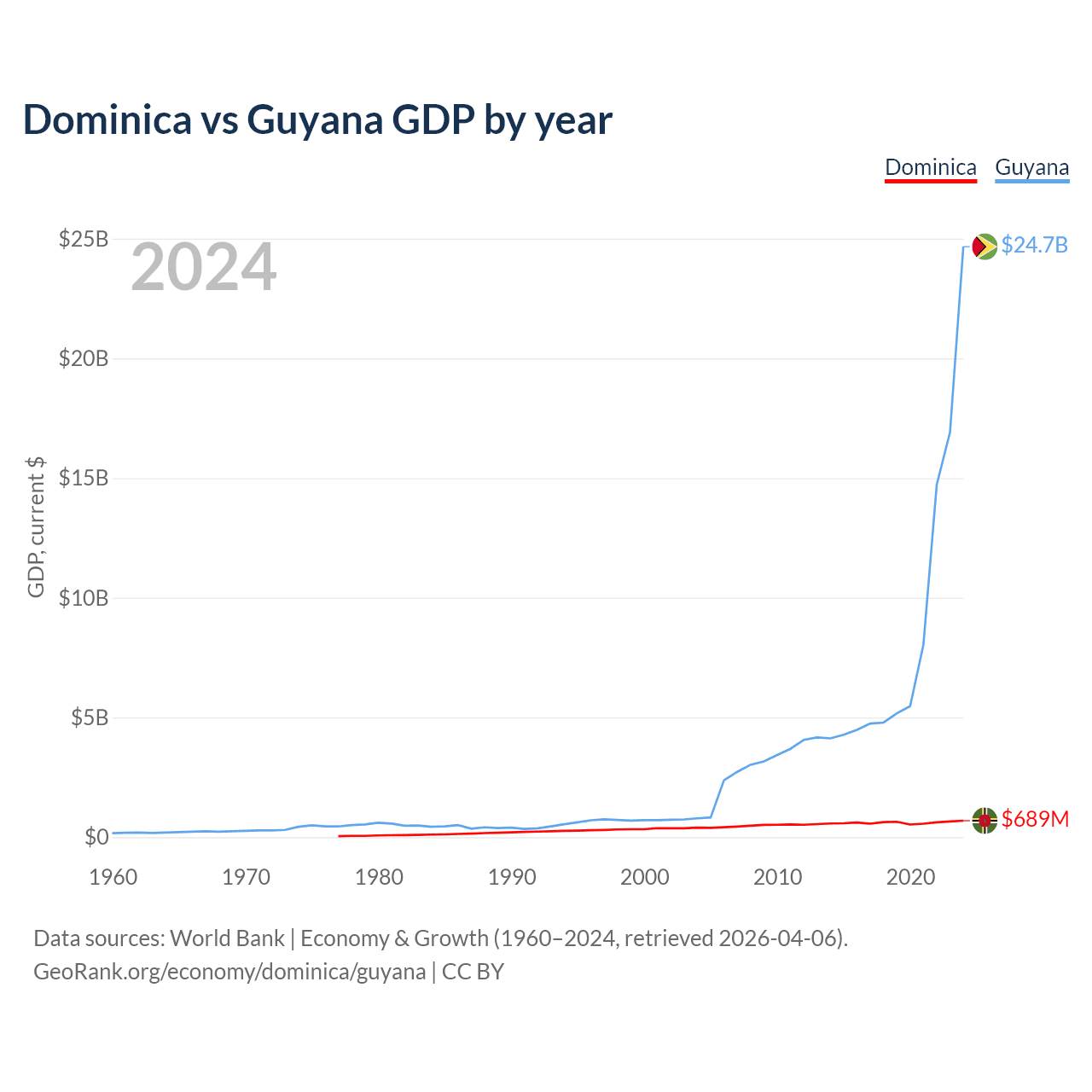 Dominica has a GDP of $689M compared to $24.7B for Guyana, ranking 190/197 and 120/197 by economy size, respectively.