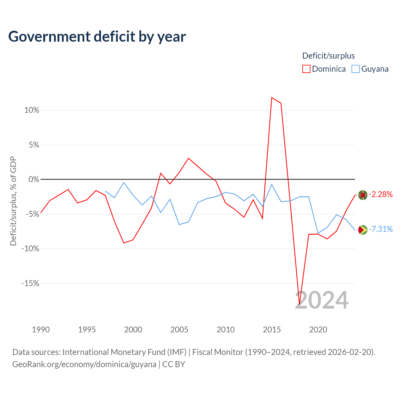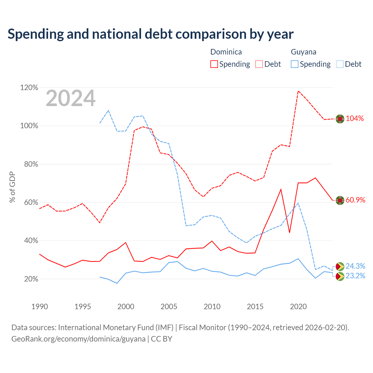 Dominica has $713M in government debt (103.5% of GDP), compared to $5.99B (24.3% of GDP) in Guyana.