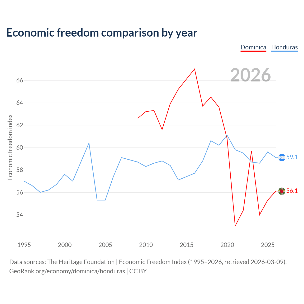 The Economic Freedom Index for Dominica is 56.1, ranking 124/197, compared to 59.1 for Honduras, ranking 105/197. The chart above displays a comparison of annual changes in economic freedom indexes.
