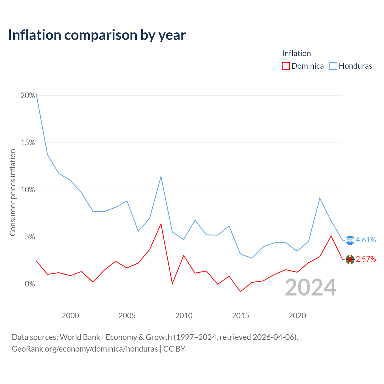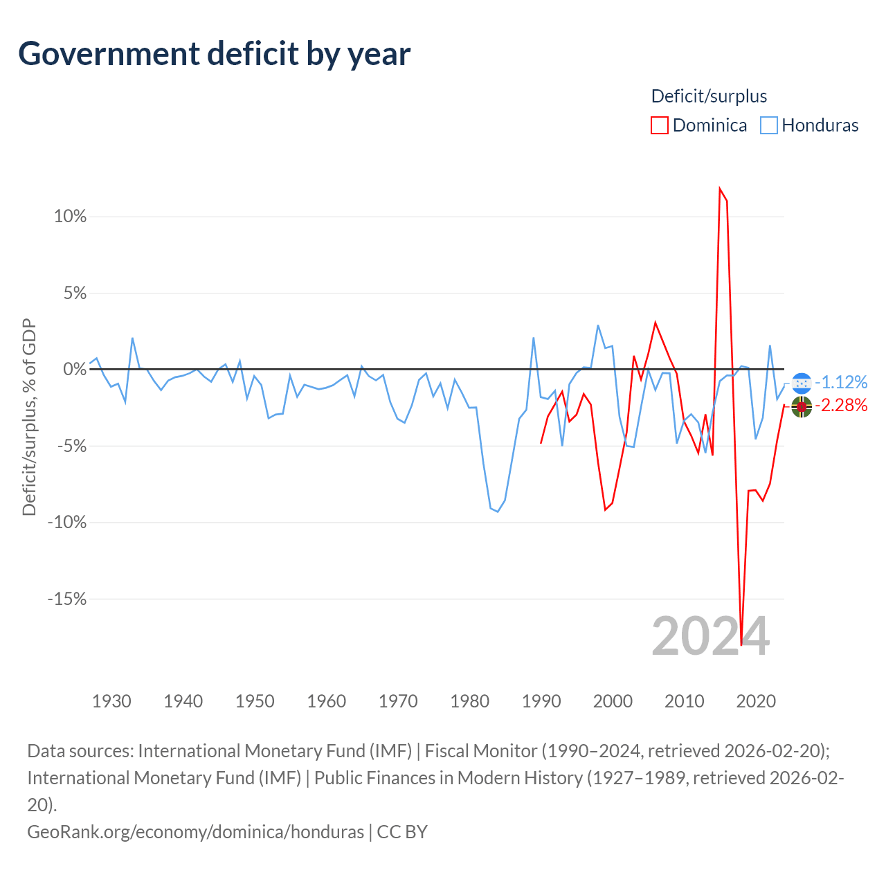 Dominica has a GDP of $689M compared to $37.1B for Honduras, ranking 190/197 and 104/197 by economy size, respectively.