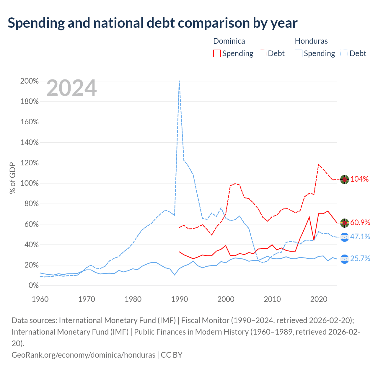 Dominica has $713M in government debt (103.5% of GDP), compared to $17.5B (47.1% of GDP) in Honduras.