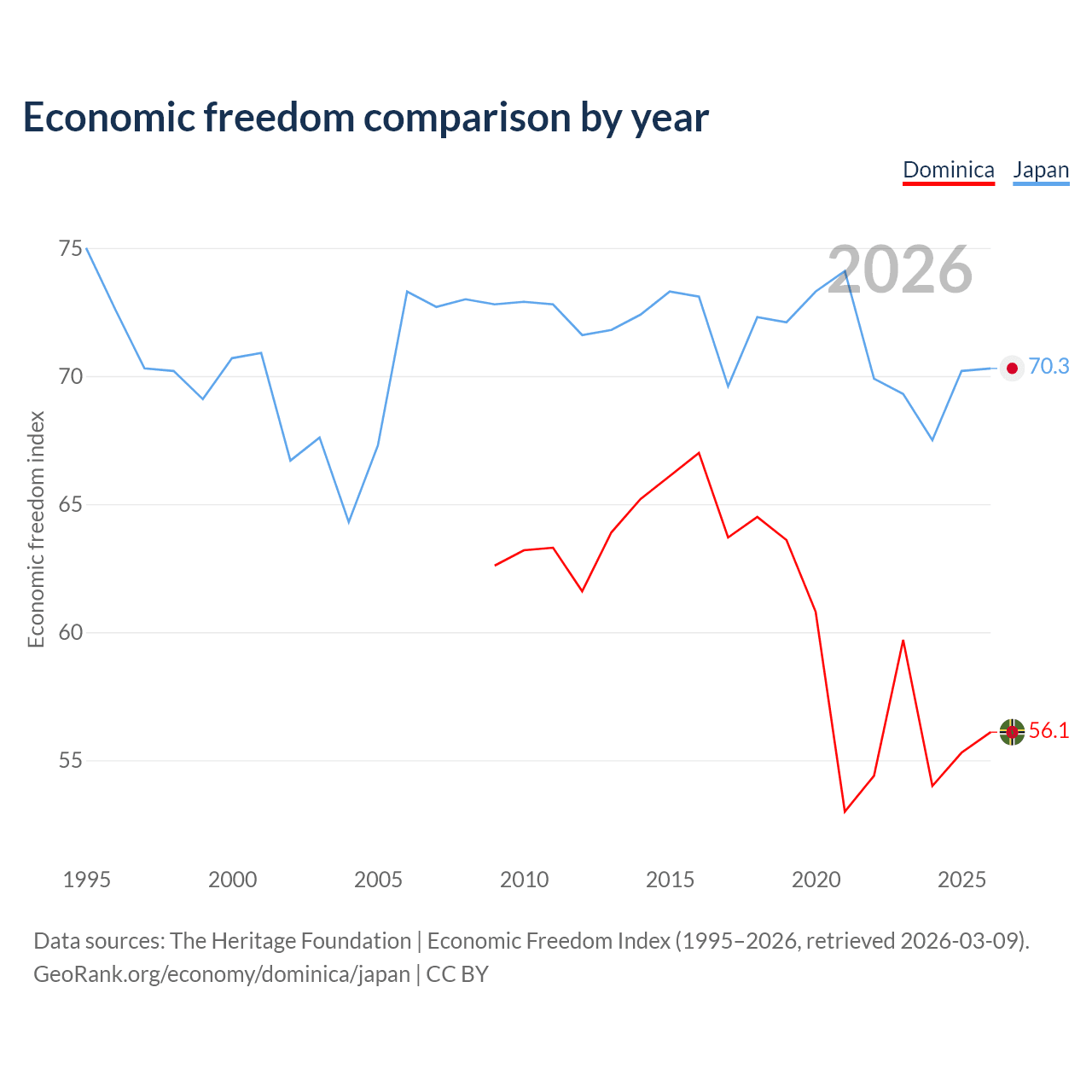 The Economic Freedom Index for Dominica is 56.1, ranking 124/197, compared to 70.3 for Japan, ranking 36/197. The chart above displays a comparison of annual changes in economic freedom indexes.
