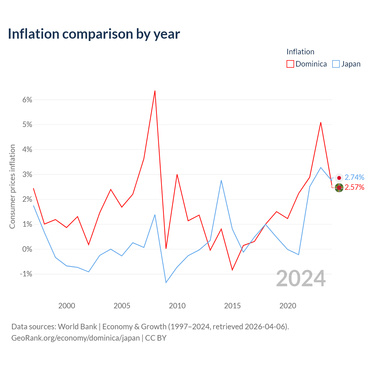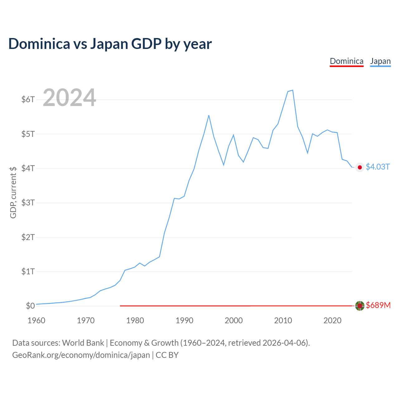 Dominica has a GDP of $689M compared to $4.03T for Japan, ranking 190/197 and 4/197 by economy size, respectively.