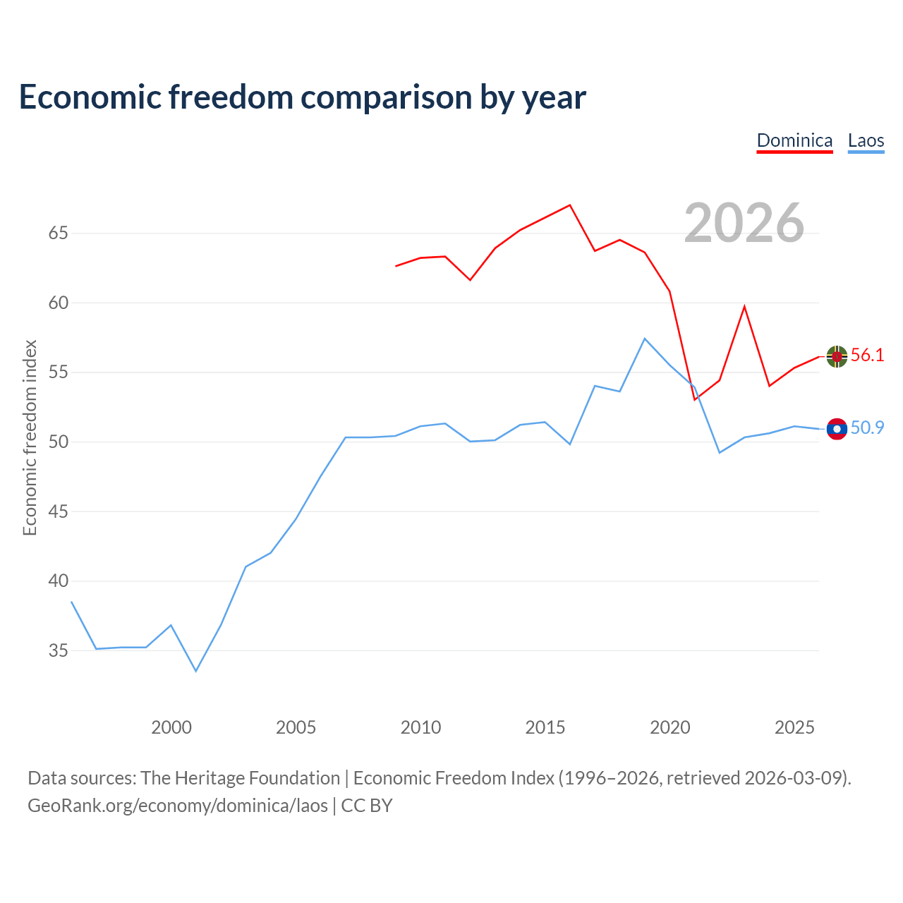 The Economic Freedom Index for Dominica is 56.1, ranking 124/197, compared to 50.9 for Laos, ranking 157/197. The chart above displays a comparison of annual changes in economic freedom indexes.