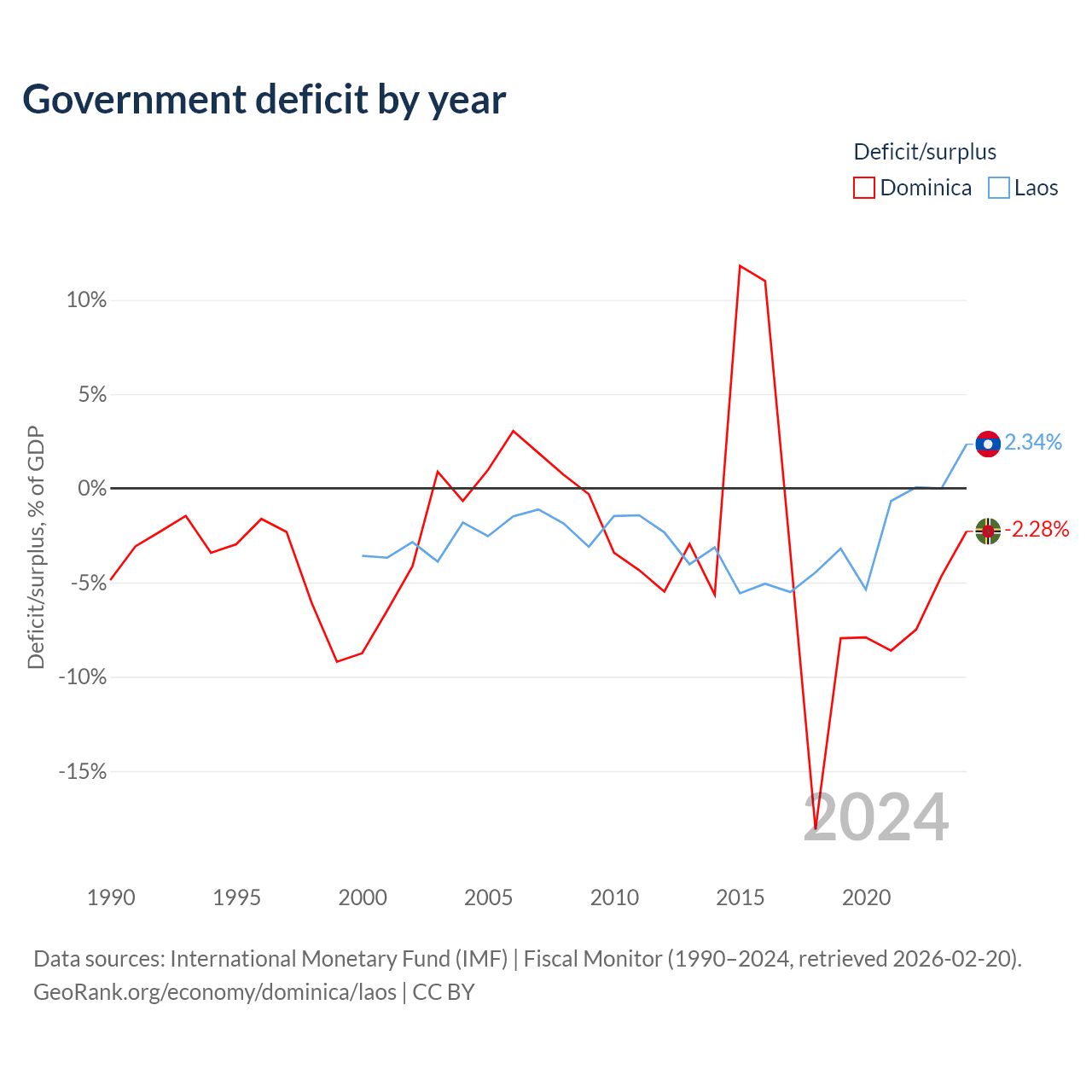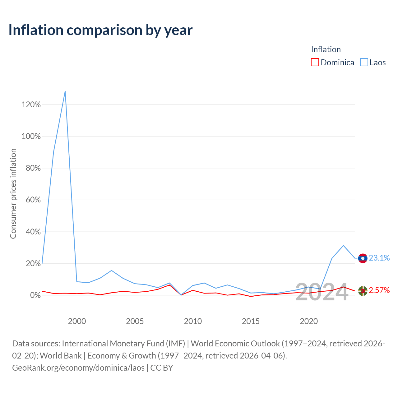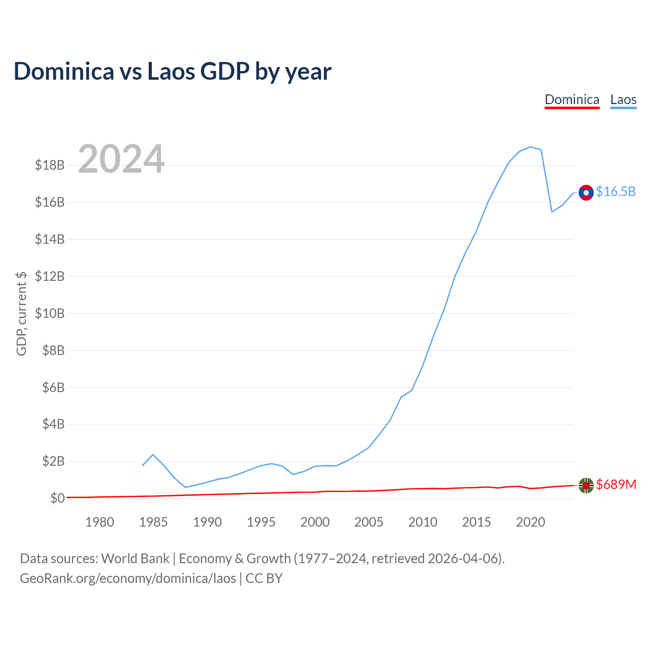 Dominica has a GDP of $689M compared to $16.5B for Laos, ranking 190/197 and 139/197 by economy size, respectively.