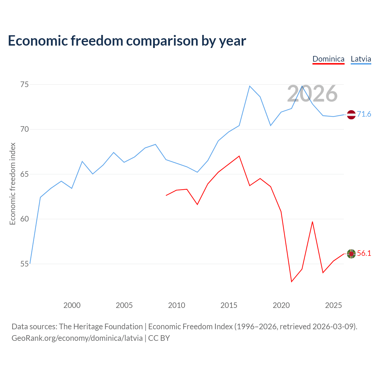 The Economic Freedom Index for Dominica is 56.1, ranking 124/197, compared to 71.6 for Latvia, ranking 31/197. The chart above displays a comparison of annual changes in economic freedom indexes.