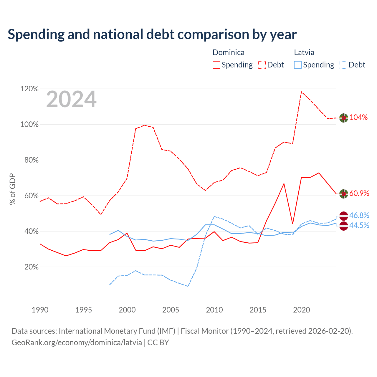 Dominica has $713M in government debt (103.5% of GDP), compared to $20.4B (46.8% of GDP) in Latvia.