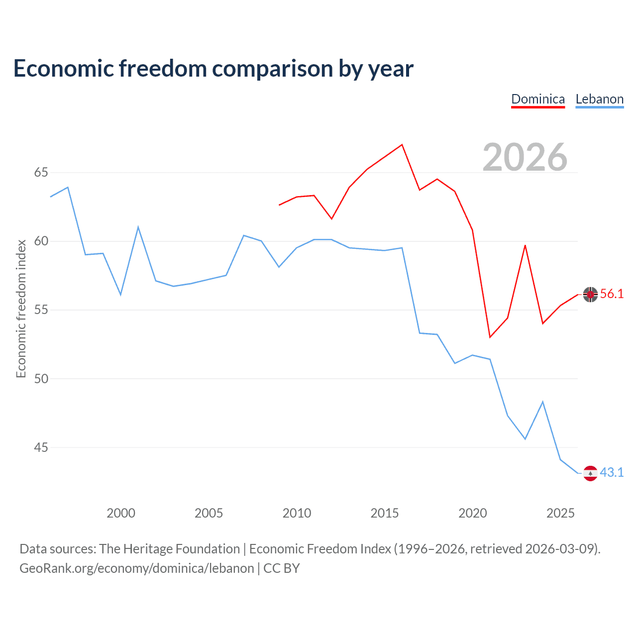 The Economic Freedom Index for Dominica is 56.1, ranking 124/197, compared to 43.1 for Lebanon, ranking 183/197. The chart above displays a comparison of annual changes in economic freedom indexes.