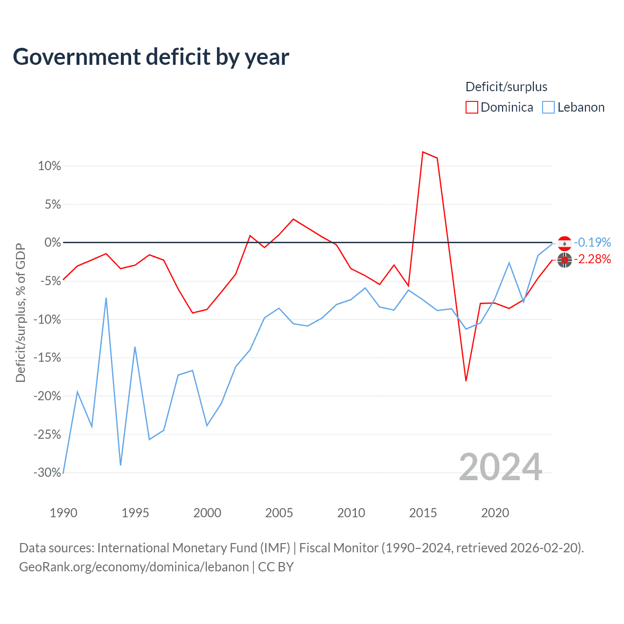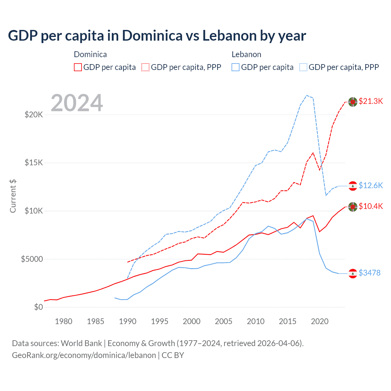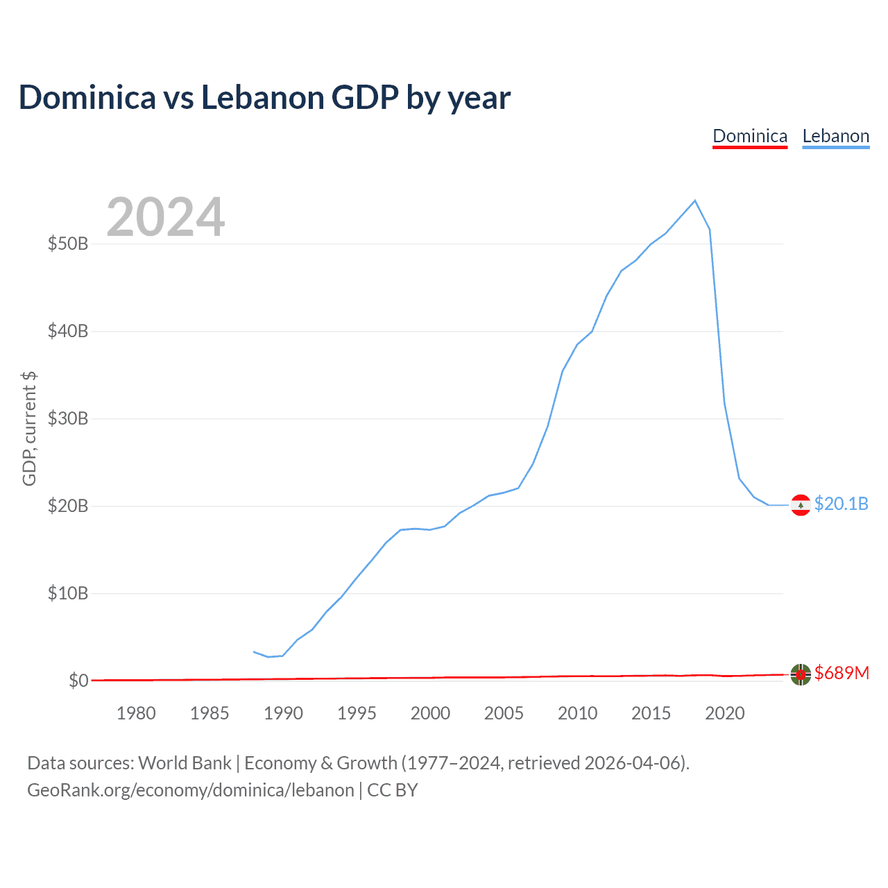 Dominica has a GDP of $689M compared to $20.1B for Lebanon, ranking 190/197 and 128/197 by economy size, respectively.