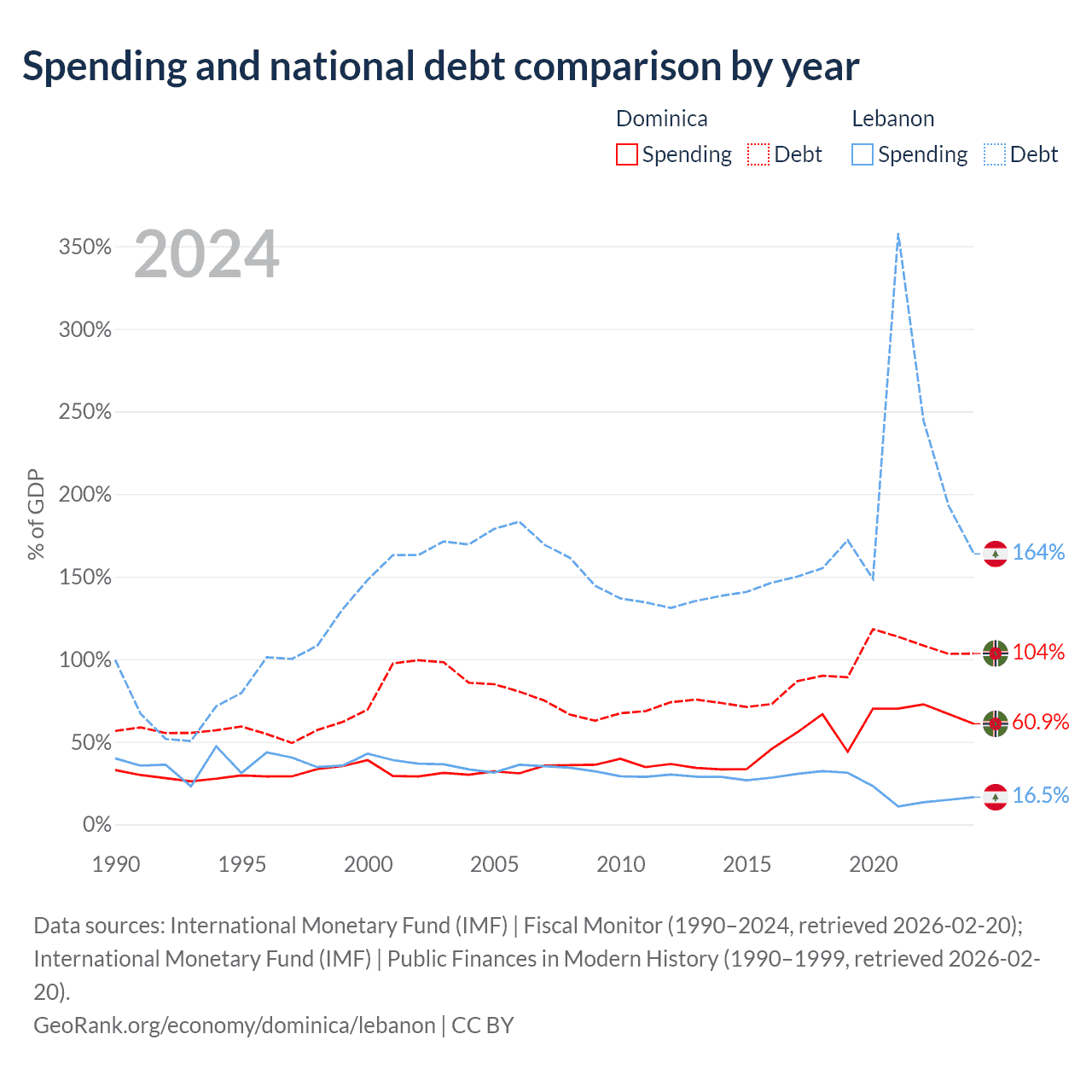 Dominica has $713M in government debt (103.5% of GDP), compared to $38.7B (163.8% of GDP) in Lebanon.