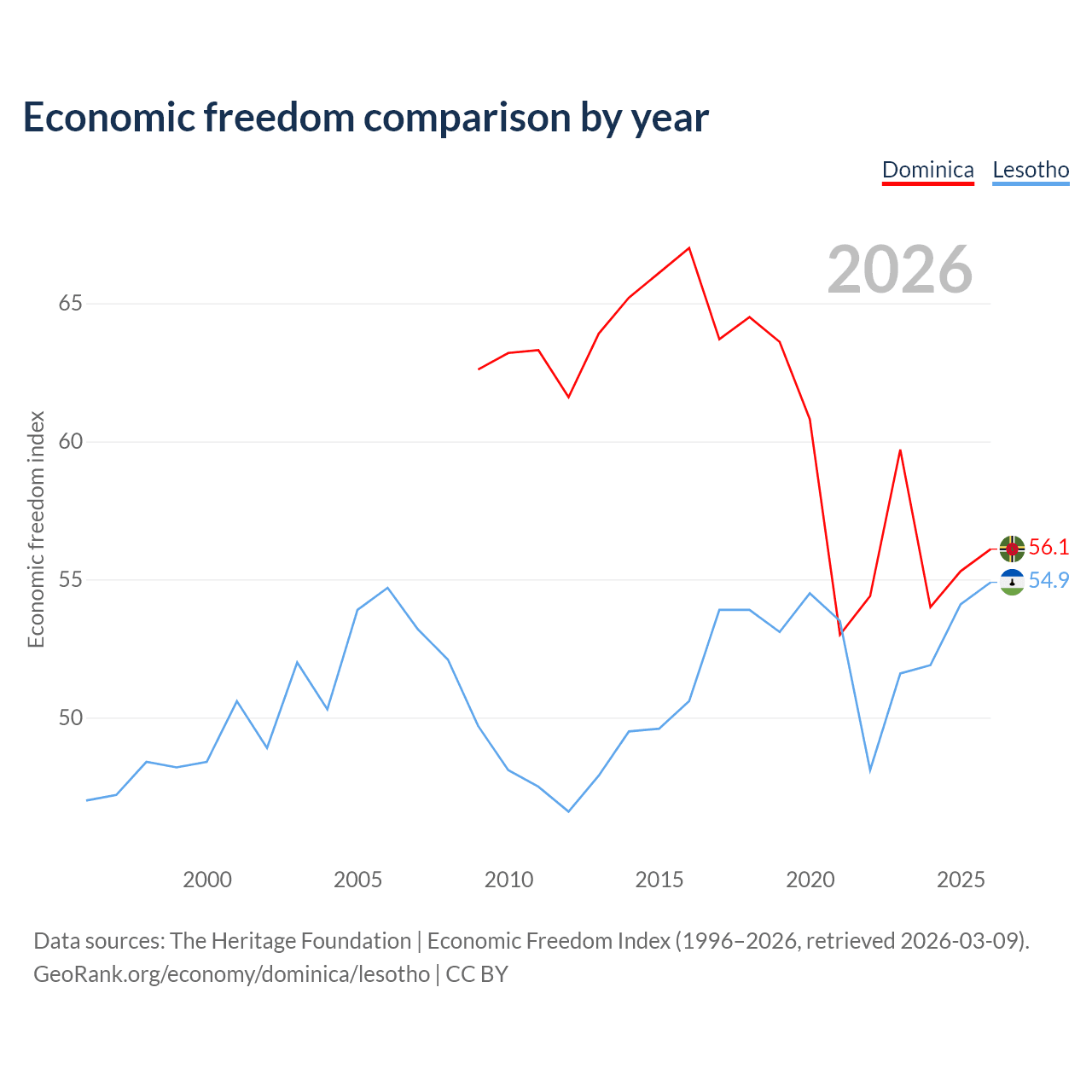 The Economic Freedom Index for Dominica is 56.1, ranking 124/197, compared to 54.9 for Lesotho, ranking 130/197. The chart above displays a comparison of annual changes in economic freedom indexes.