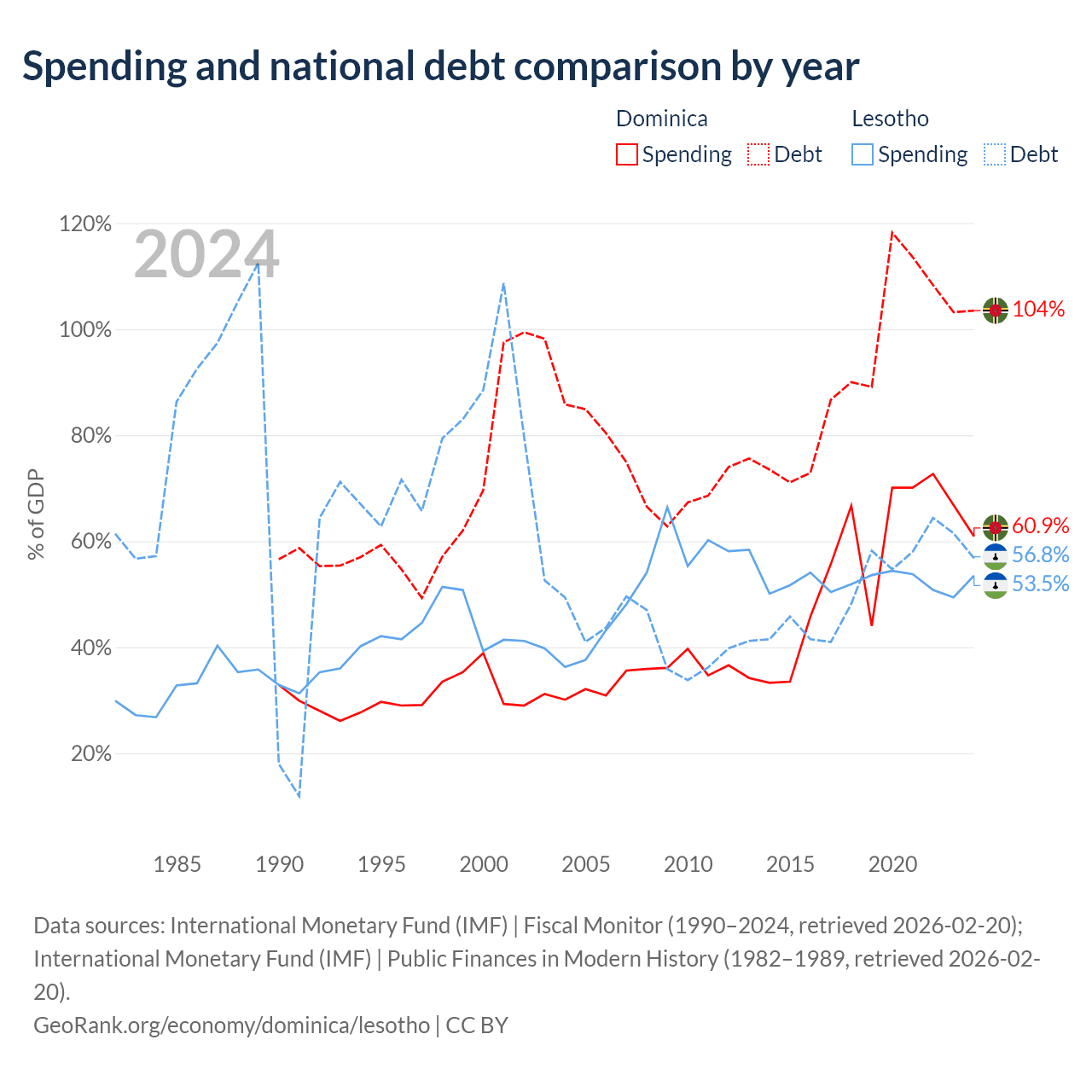 Dominica has $713M in government debt (103.5% of GDP), compared to $1.29B (56.8% of GDP) in Lesotho.